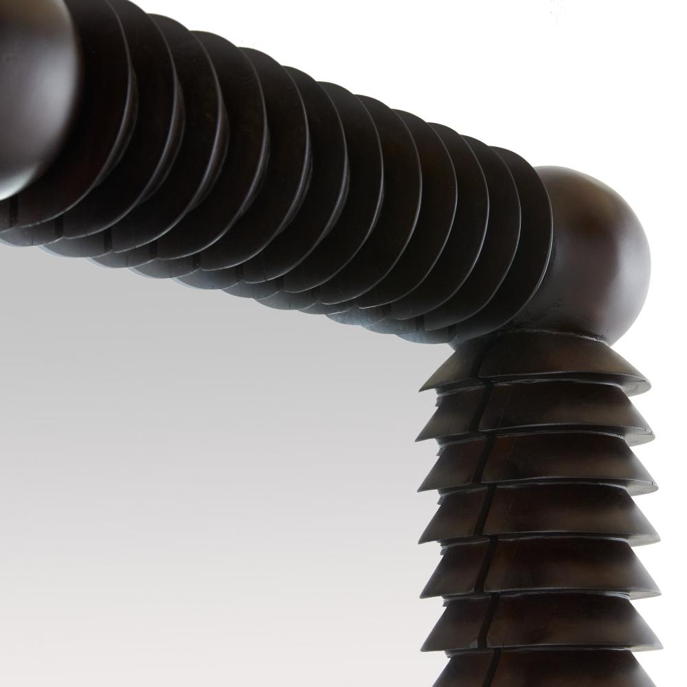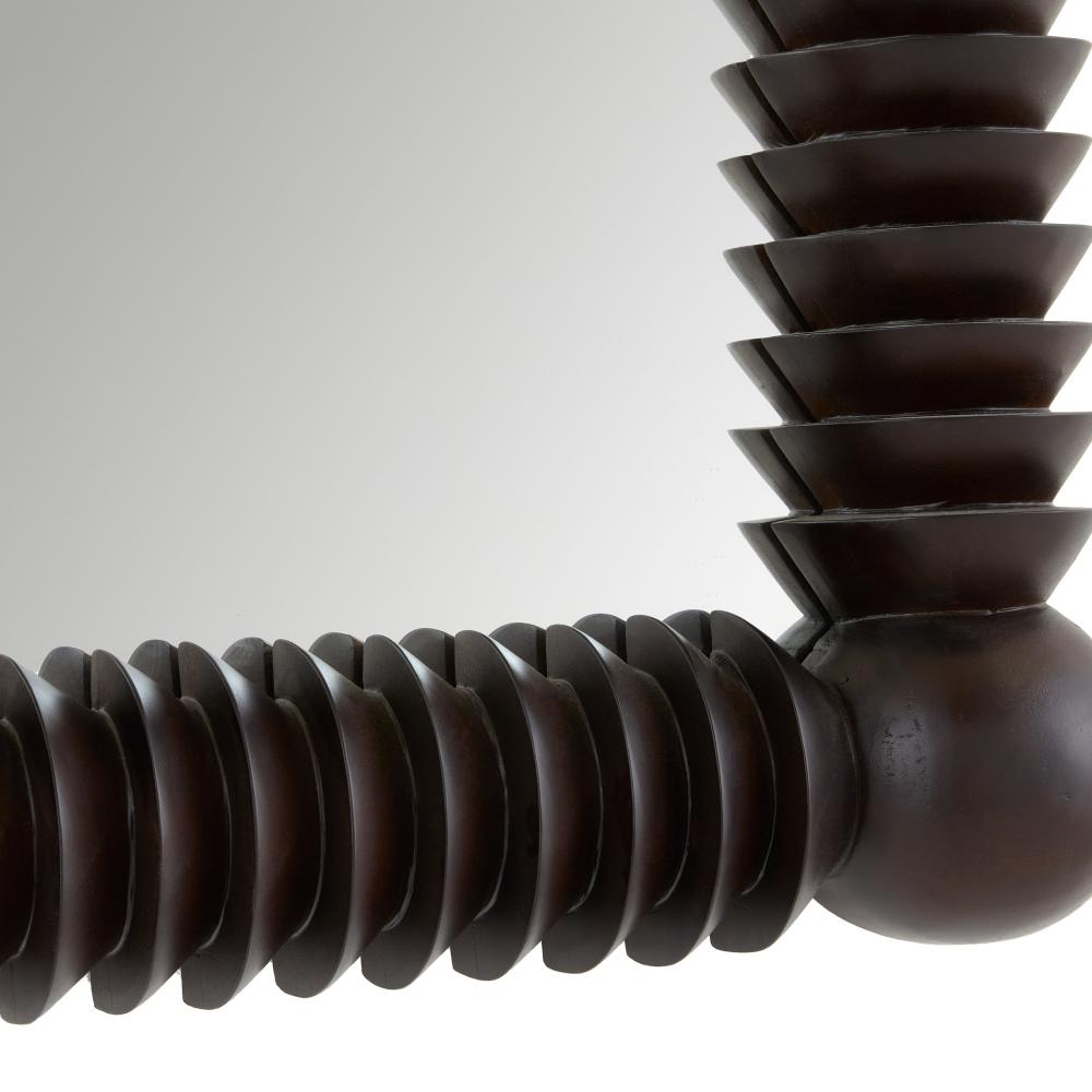 This shingled style has a curated aesthetic reminiscent of the arts and crafts movement. Intricately carved of umber mango wood with circular accents, the rippling frame supports a square mirror that can be hung vertically or horizontally. A cleat attachment assures secure display. Finish will vary.