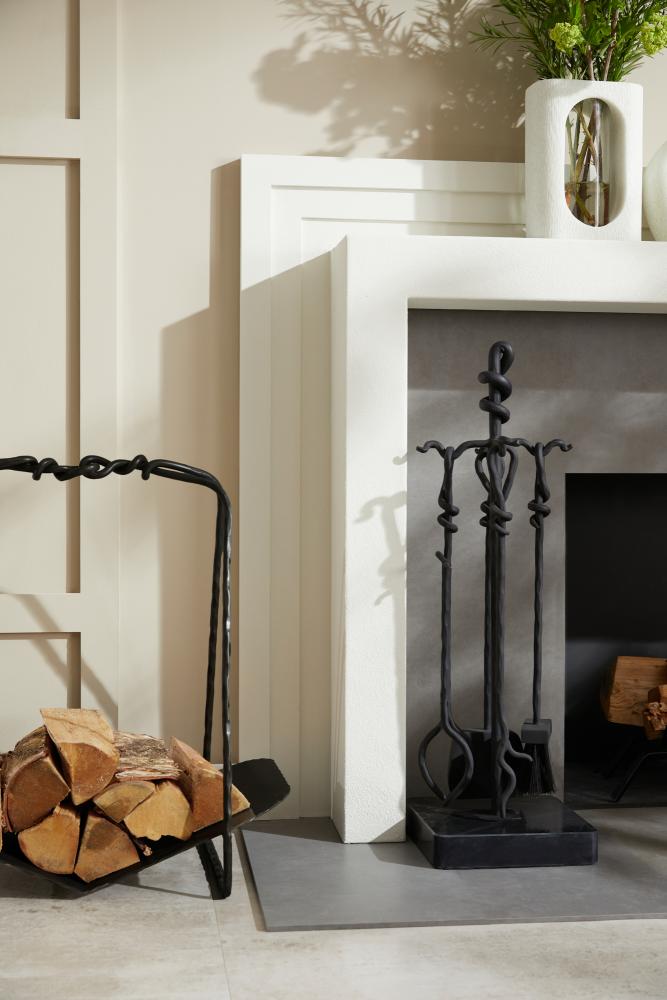 Inspired by medieval ironwork, a blackened, hammered iron toolset offers a playful and literal twist on a timeless hearth essential. The angular handles of the poker, shovel, and tongs entwine together in a form reminiscent of the twisted roots of a tree. A matching iron base complements the set. Designed to pair with the Denison Log Holder. Finish will vary.