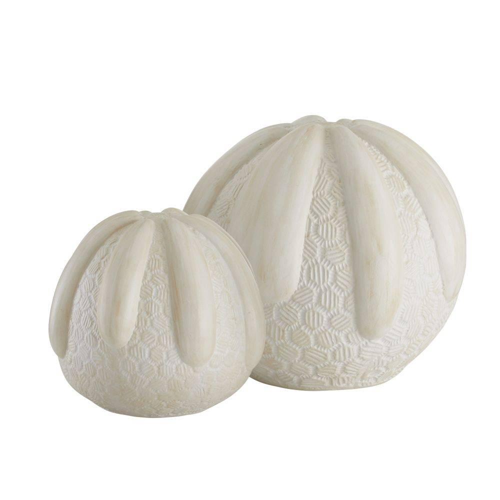 The rounded form of a sea urchin inspired our pair of terracotta sculptures. Each layered and textured style offers a pleasing mix of smooth and intricately carved textures. Glazed with a whitewash finish, they deliver a monumental presence wherever they are placed. Finish will vary.