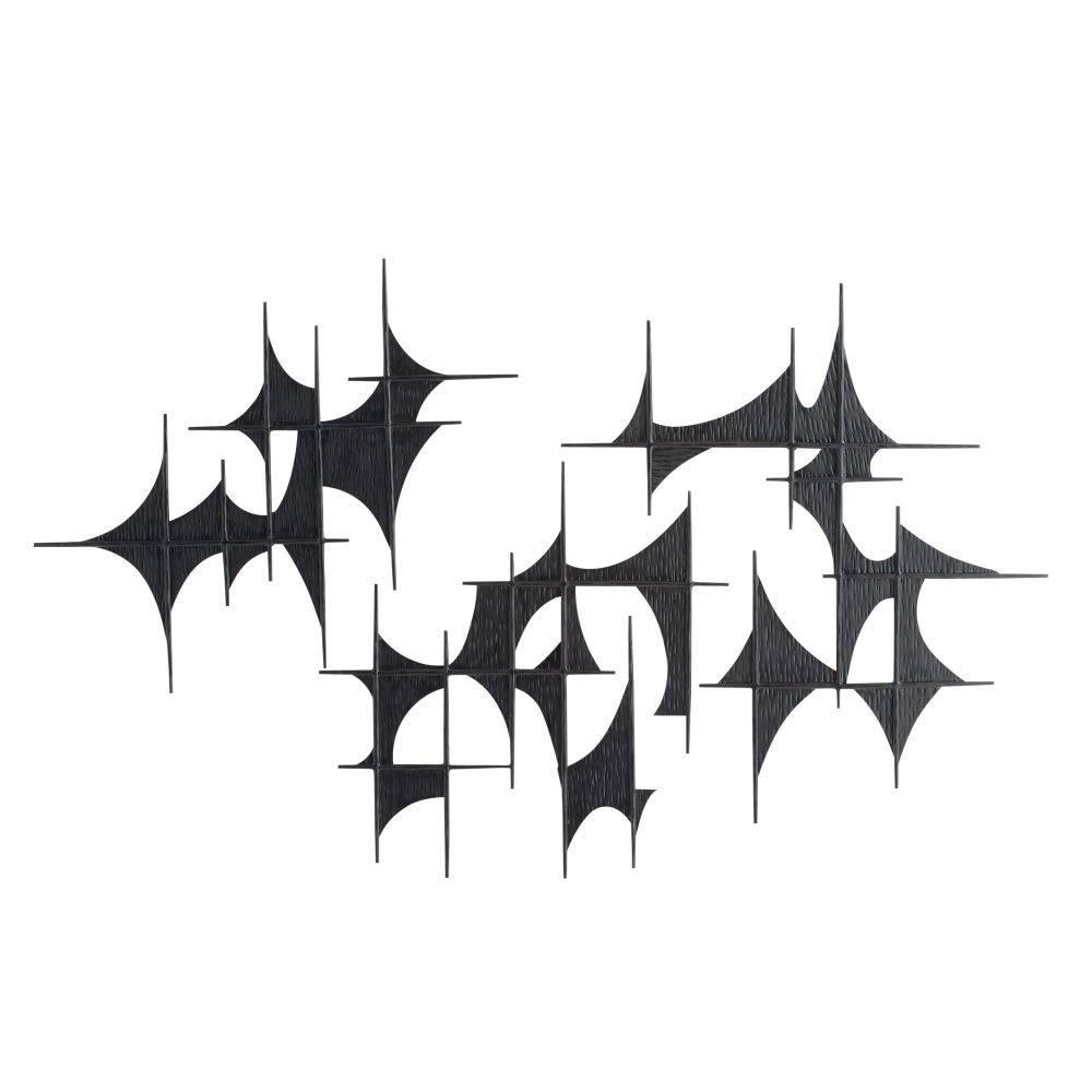 A trio of plaques of black-forged iron draw from the best of mid-century Brutalist forms. With the look of sails stretched between posts, the textured angles and curves are elegant on their own and even more impactful when displayed together. Arrange them in multiple ways to create a custom look. Keyhole attachment for secure hanging.