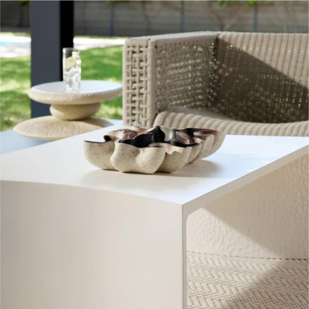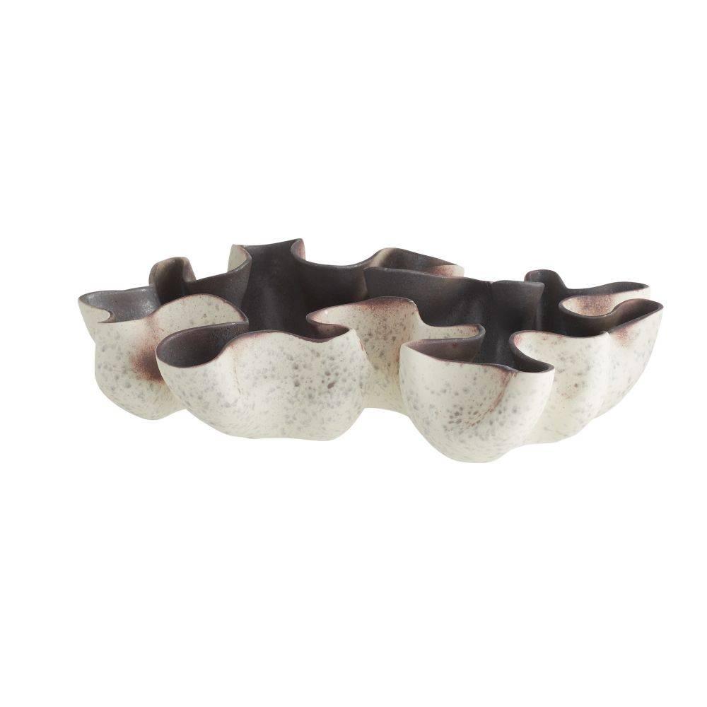 The free-form shapes of branching coral are echoed in a dramatic porcelain centerpiece. Glazed in our new sparrow reactive shade with a gunmetal reactive interior, the mix of hues results in a bleed of oxblood accents along each sinuous seam. Finish will vary.