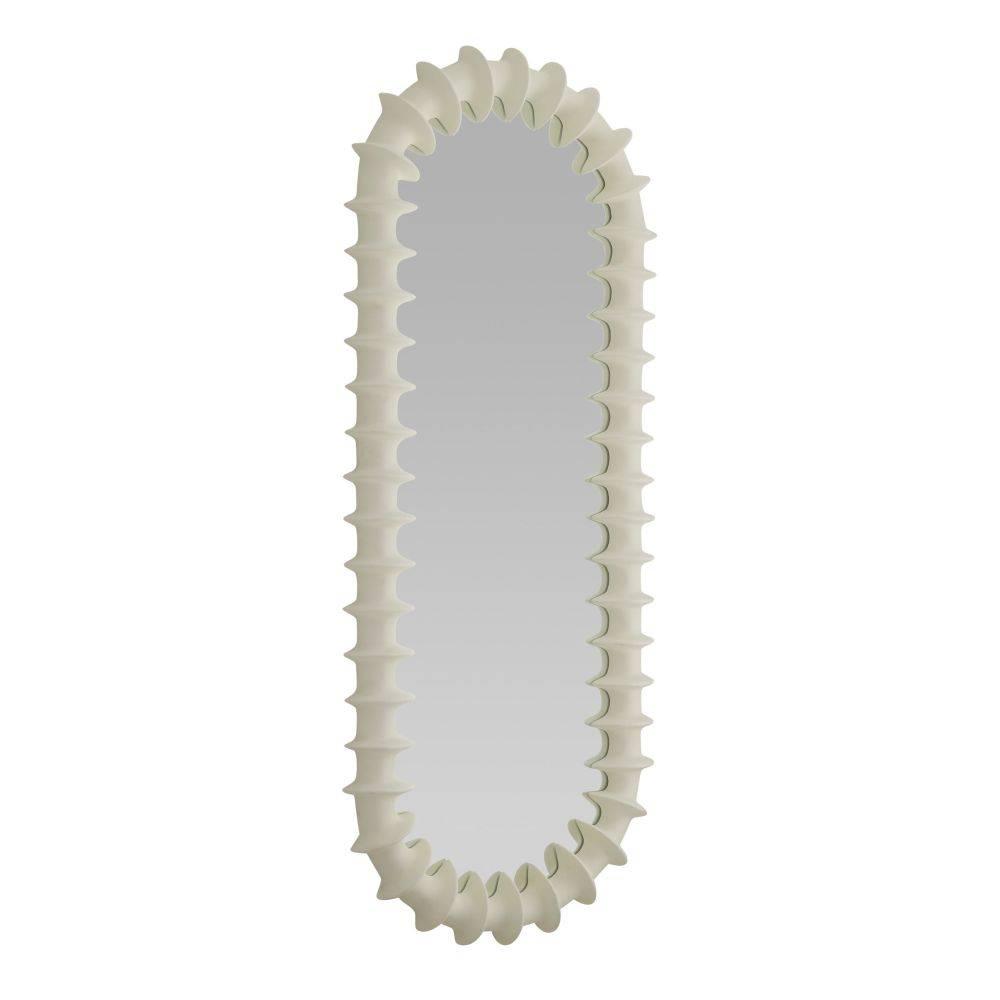 A textural frame of matte ivory resin ripples and flows to recall the ridges of a spine. Its intriguing finish converges inward, creating dimensionality on any wall. Designed to be displayed both vertically and horizontally. Secured at the back with a cleat attachment.