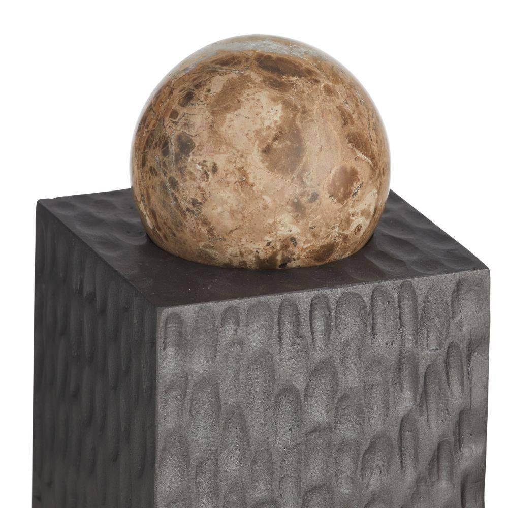 Monolithic resin pedestals of ash brown and graphite tones are the ideal base for this set of mixed-material forms. Textured with daubs and grooves, each sculpture is topped with a polished marble sphere in a contrasting forest or chamois shade. Can double as a stylish storage compartment for small items. Finish will vary.