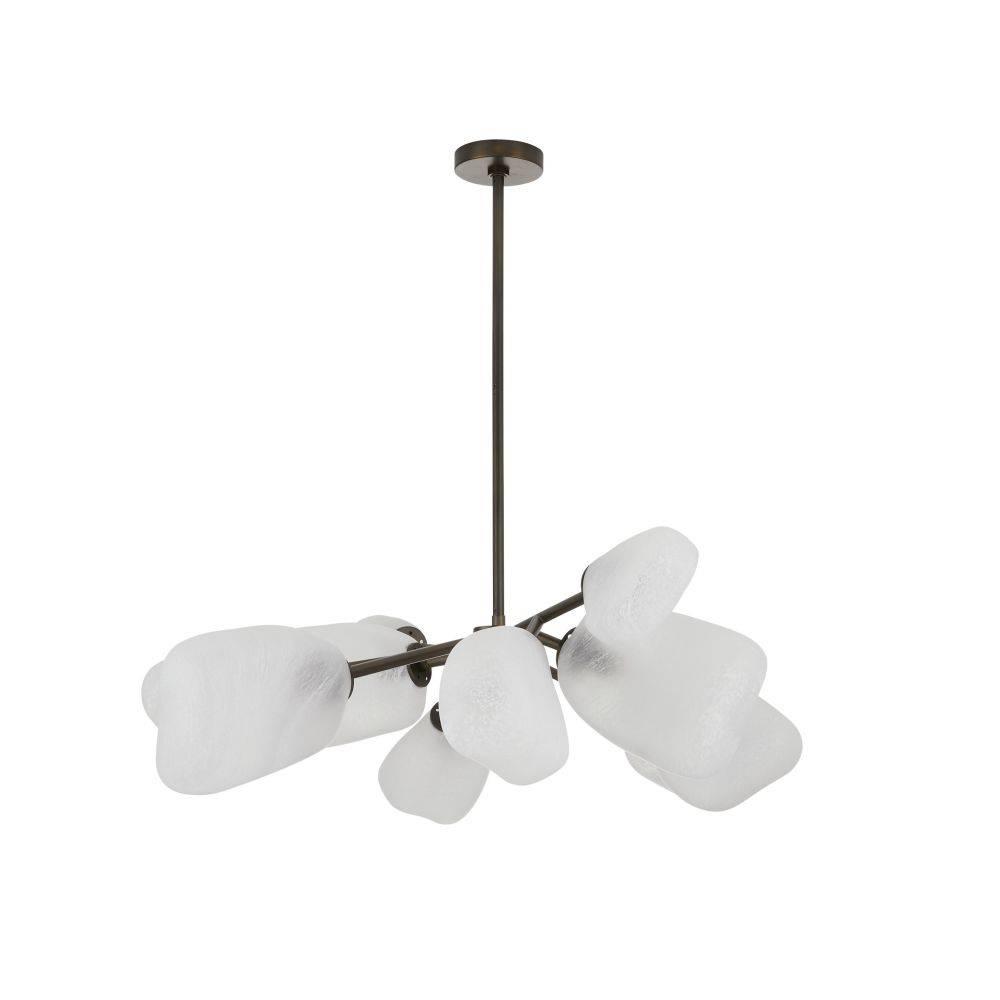 Billowing, modern frosted glass rounded cubes lend an organic feeling to our impactful chandelier. Each irregular shade differs slightly, giving this sculptural fixture a unique presence. Suspended from a branched form of English bronze-plated steel with matching pipe. Damp-rated, although limited covered outdoor areas may affect finish.