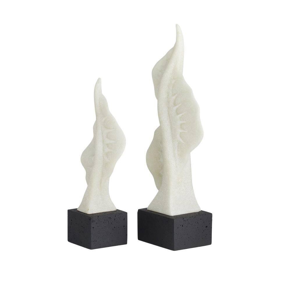 The sculptural silhouettes of marine life are reflected in these ivory ricestone composite sculptures. Reminiscent of seaweed or a Portuguese man-of-war fin, each twisted form stretches upward while secured to a charcoal ricestone composite base. Finish will vary.