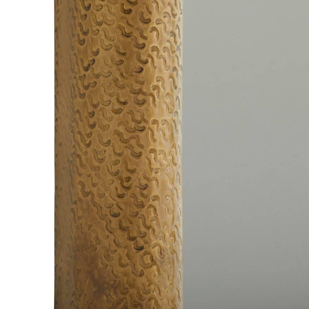 Evocative of an ancient shield, a bullnose frame of brass clad is finished with a hammered squiggle texture. Its robust form is designed to be displayed vertically with either the smaller or broader end at the top. Cleat attachment for secure hanging.