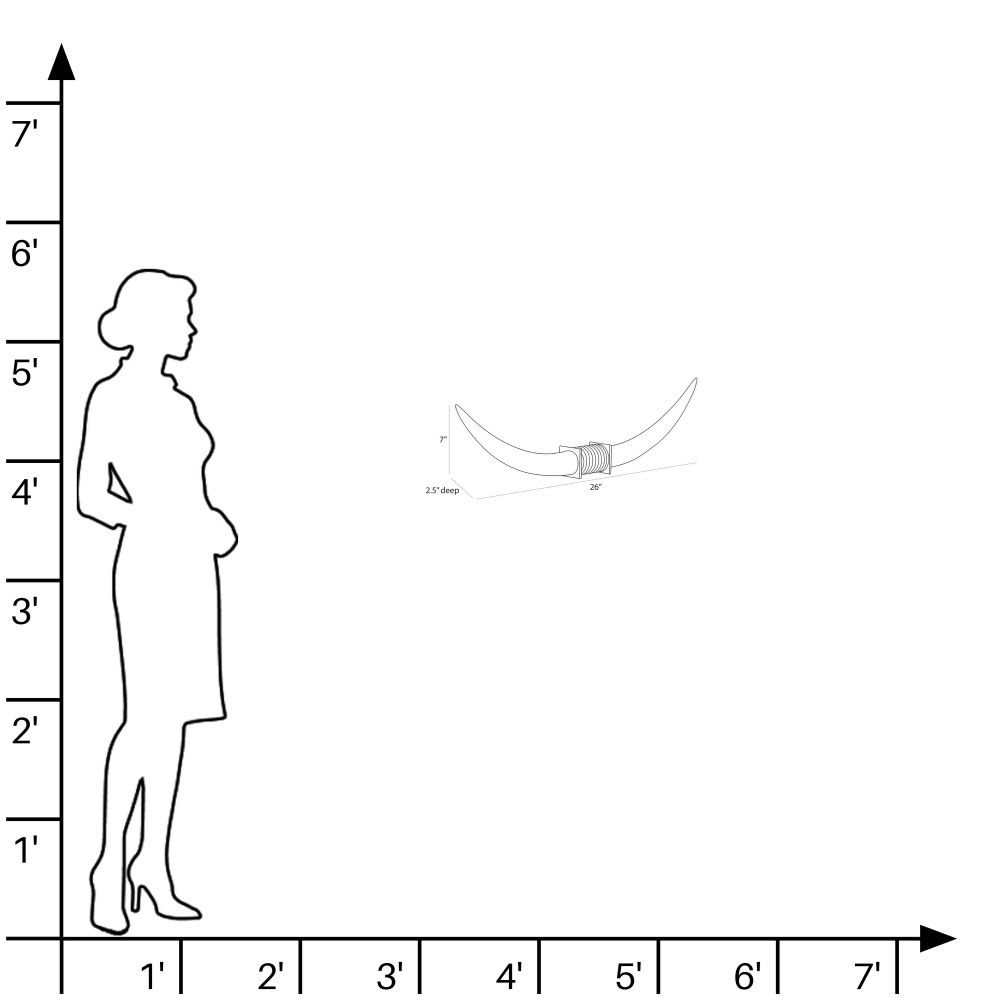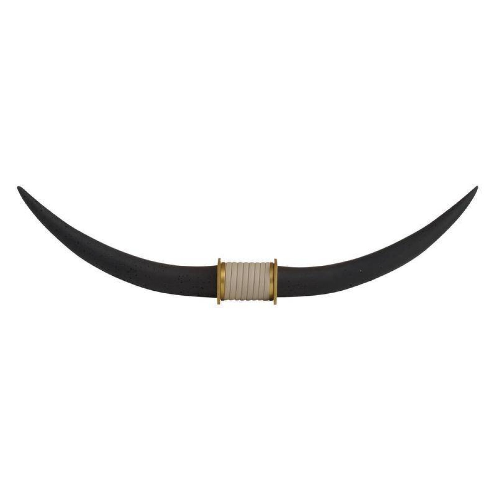 Reminiscent of a Texas longhorn steer, this elegant sculpture's linear shape makes an impact on a console or mantle. Each form of charcoal ricestone composite is securely mounted to a base of antique brass steel, accented with an inset of light gray leather for contrast.
