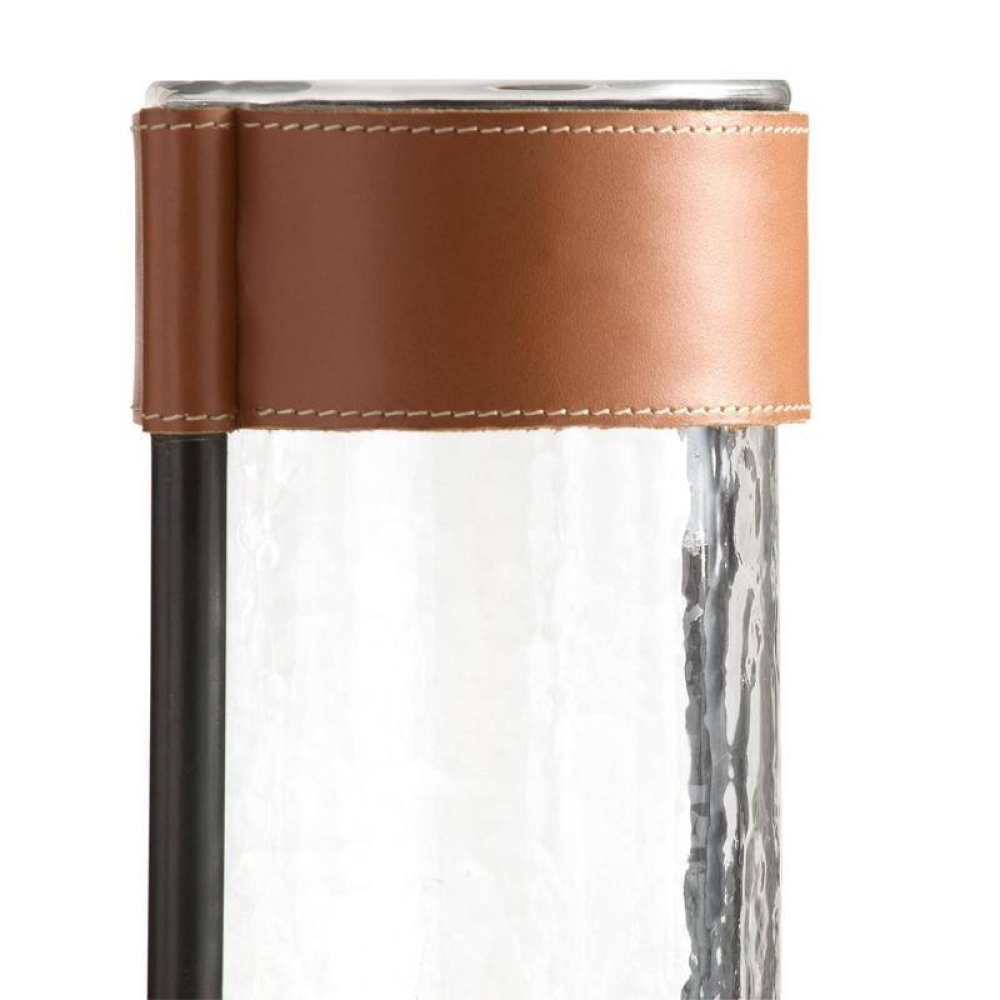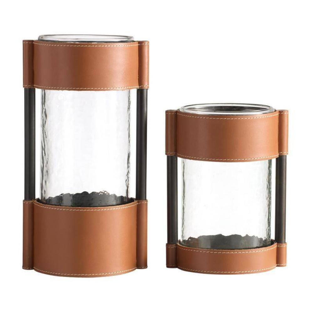 Drawing from the iconography of the equestrian set, a pair of clear hammered glass vases are suspended in settings of brown leather. Topstitched and held by bronze iron supports, the pair are staggered in height for visual interest. The watertight glass cylinders are removable for cleaning. Finish will vary.