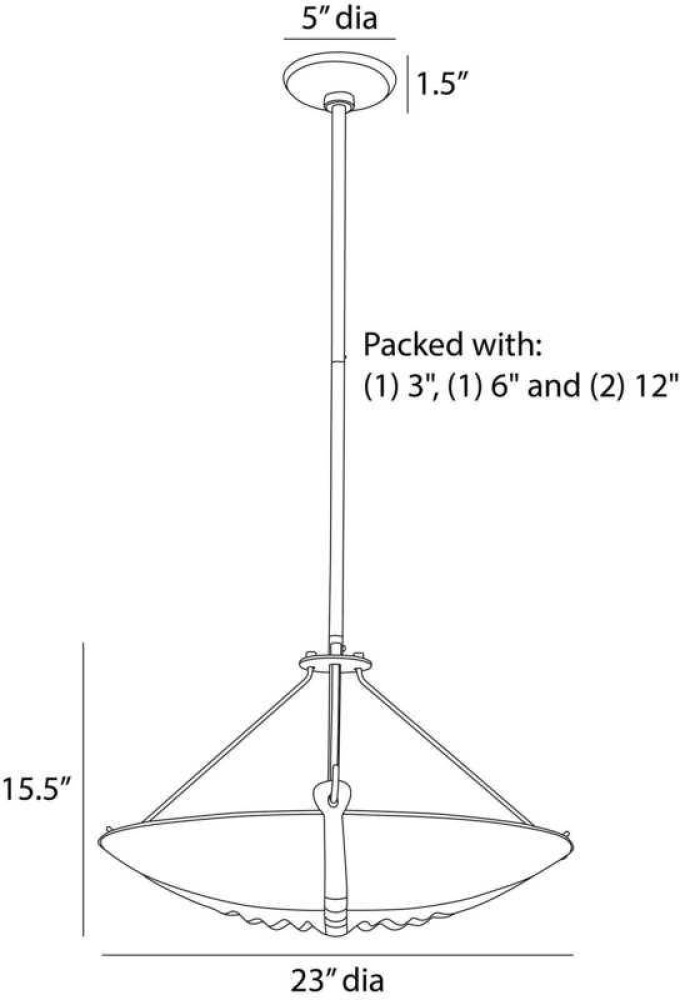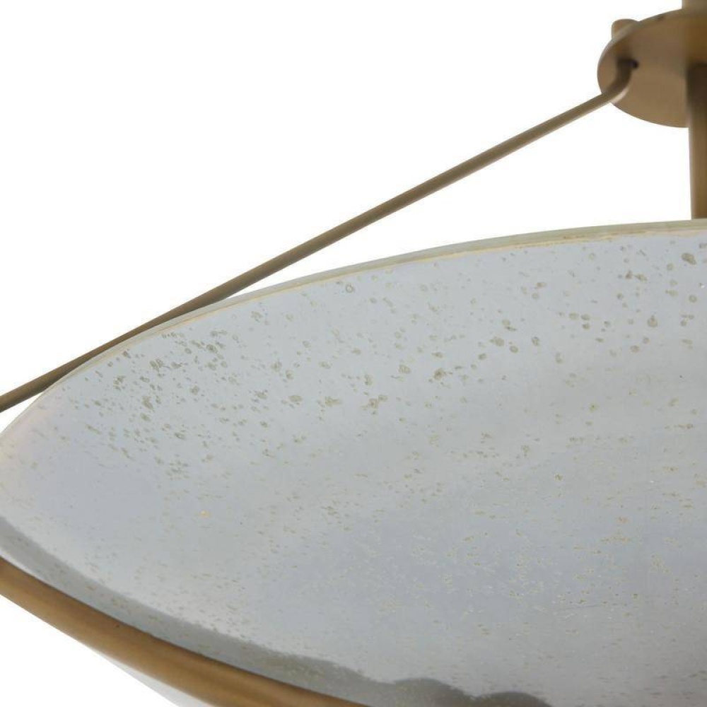 Skeletal structure informs a fixture of antique brass-plated iron. Each arm connects to suspend a frosted glass disc, providing a wash of light across the ceiling. The semi-flush fixture is suspended from an antique brass-plated iron pipe and holds a trio of candelabra bulbs. Damp-rated, although limited covered outdoor conditions may affect finish. Finish will vary.