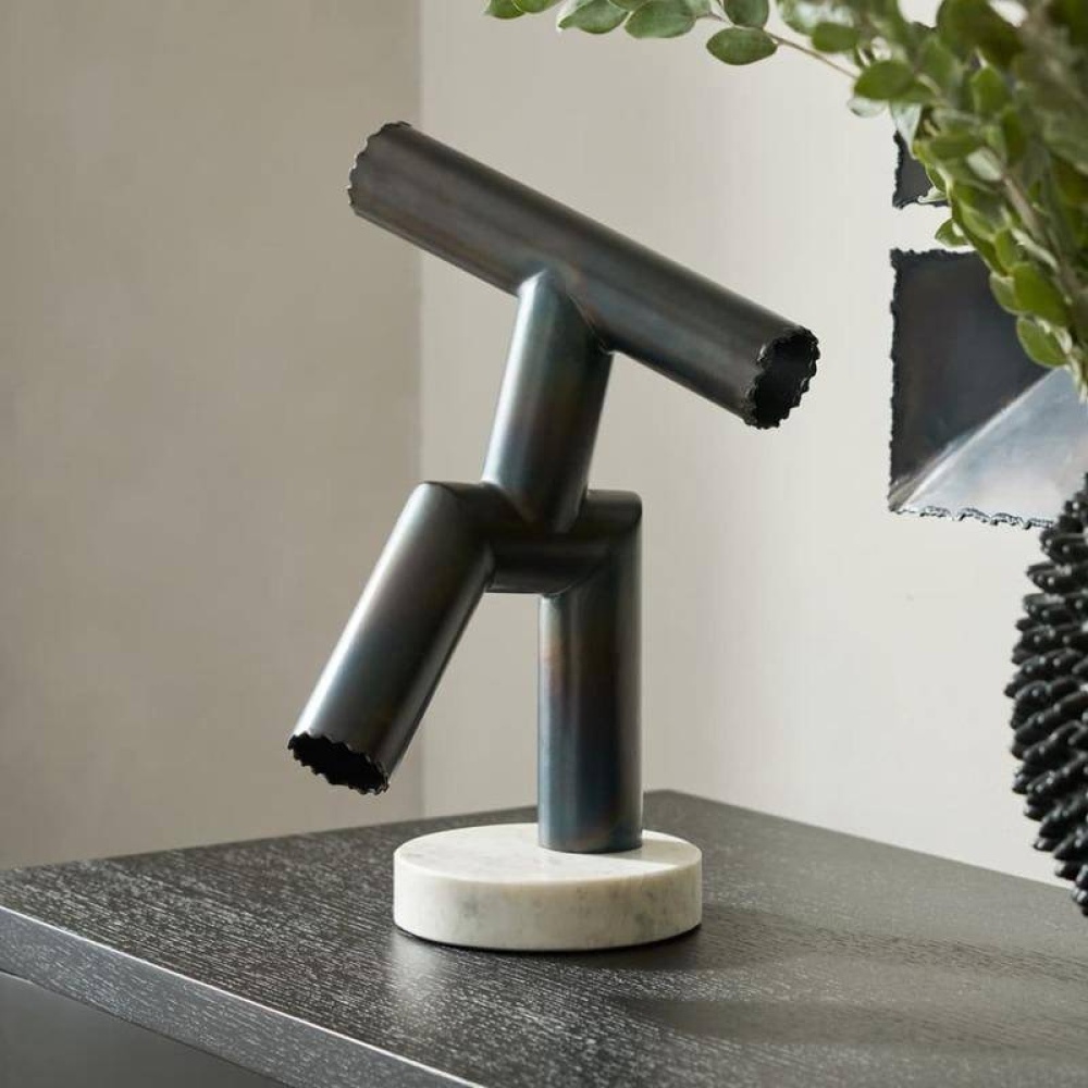 We distilled a figure to its most essential elements. With its dynamic dancing pose, this burnt iron piece appears to have a twisting motion as it suspends on a single leg. Torched details accent the end of every "limb." Mounted on a rounded base of white marble. Finish will vary.