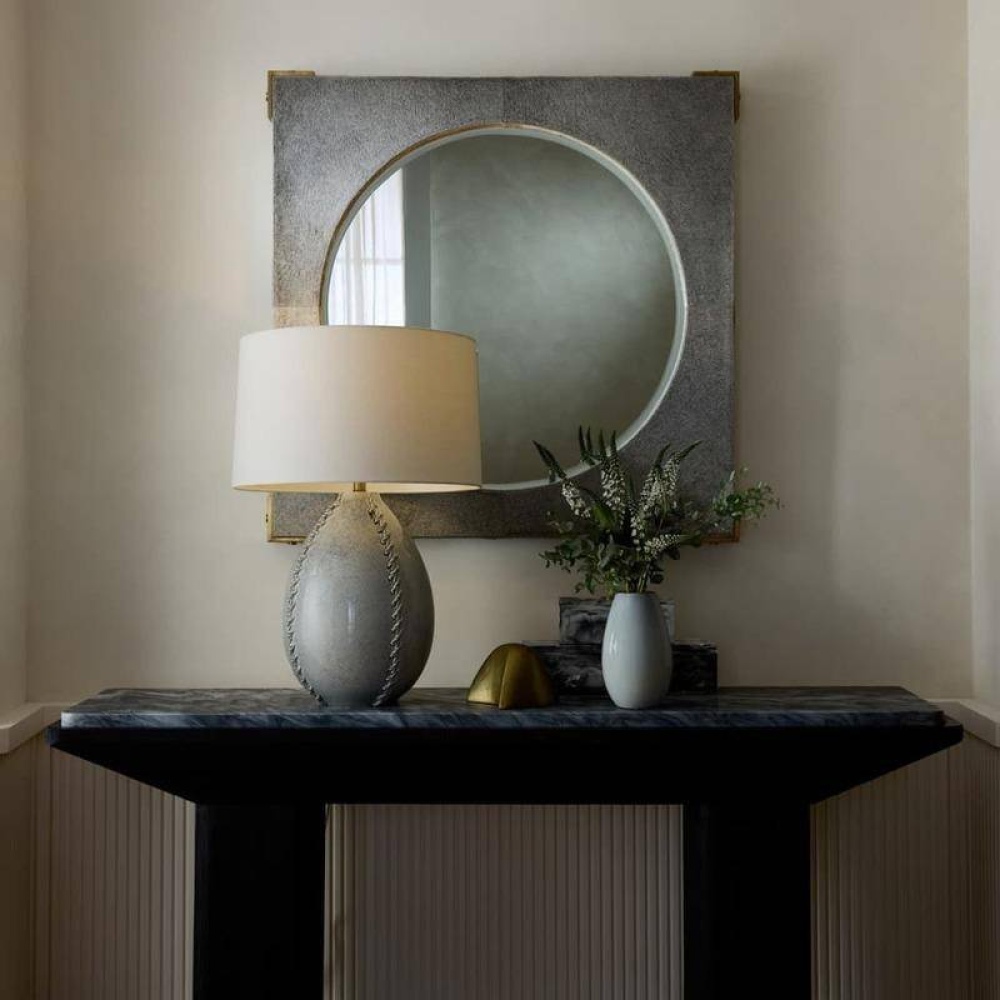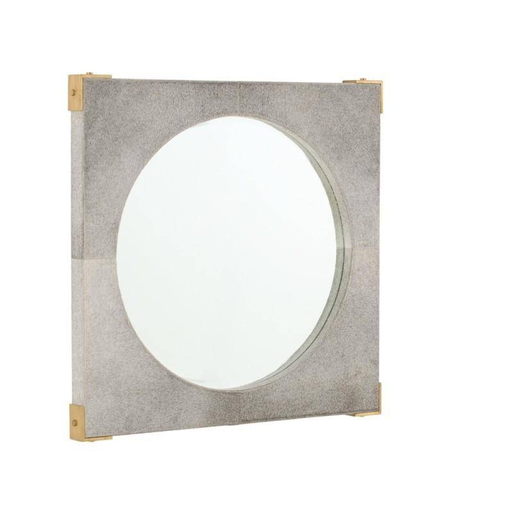 Lush gray hair-on-hide panels add textural appeal to our campaign-style mirror. Subtle gradations in tone make each frame one-of-a-kind. Bracketed by accents of antique brass hardware, they surround a recessed beveled glass mirror. Designed to be hung vertically by a back cleat. Hanging hardware included. Hide will vary.
