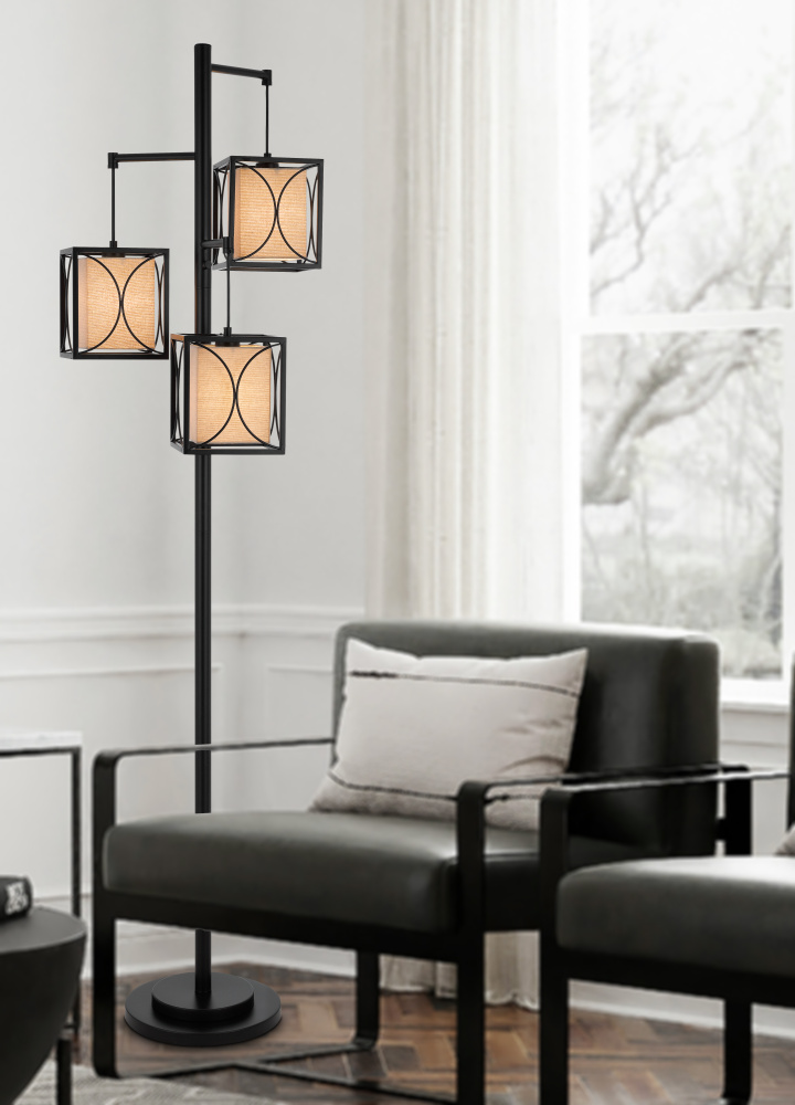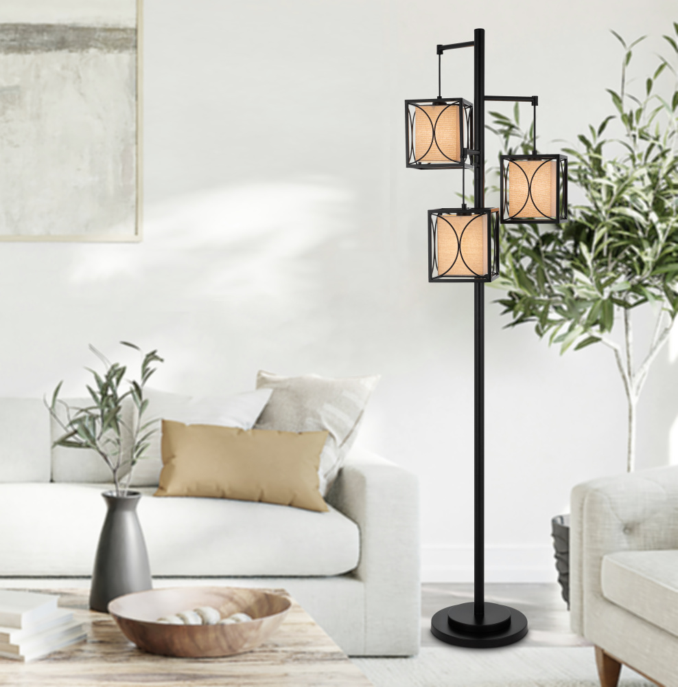 60W x 3 Lantern metal floor lamp with metal framed fabric shades