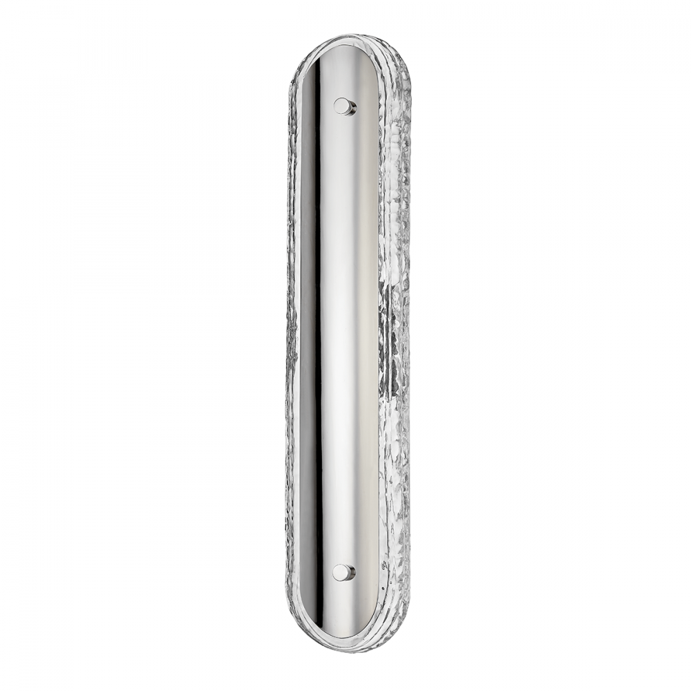 A smooth piece of convex metal is placed over a similarly shaped piece of clear textured glass. Light reflects off Macau's metalwork and flows down the step-like ridges in the glass filling the entire fixture with a sparkling, layered glow.