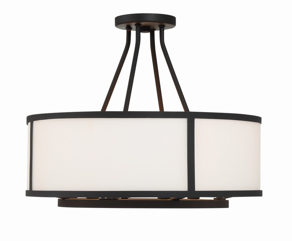Showcasing a classic drum, the Bryant is crafted with a white glass shade and black steel frame. The outer drum surrounds an inner suspension of candelabra sockets. The contrasting materials and bold graphic lines provide a design-driven style and a striking visual accent to many interior settings.