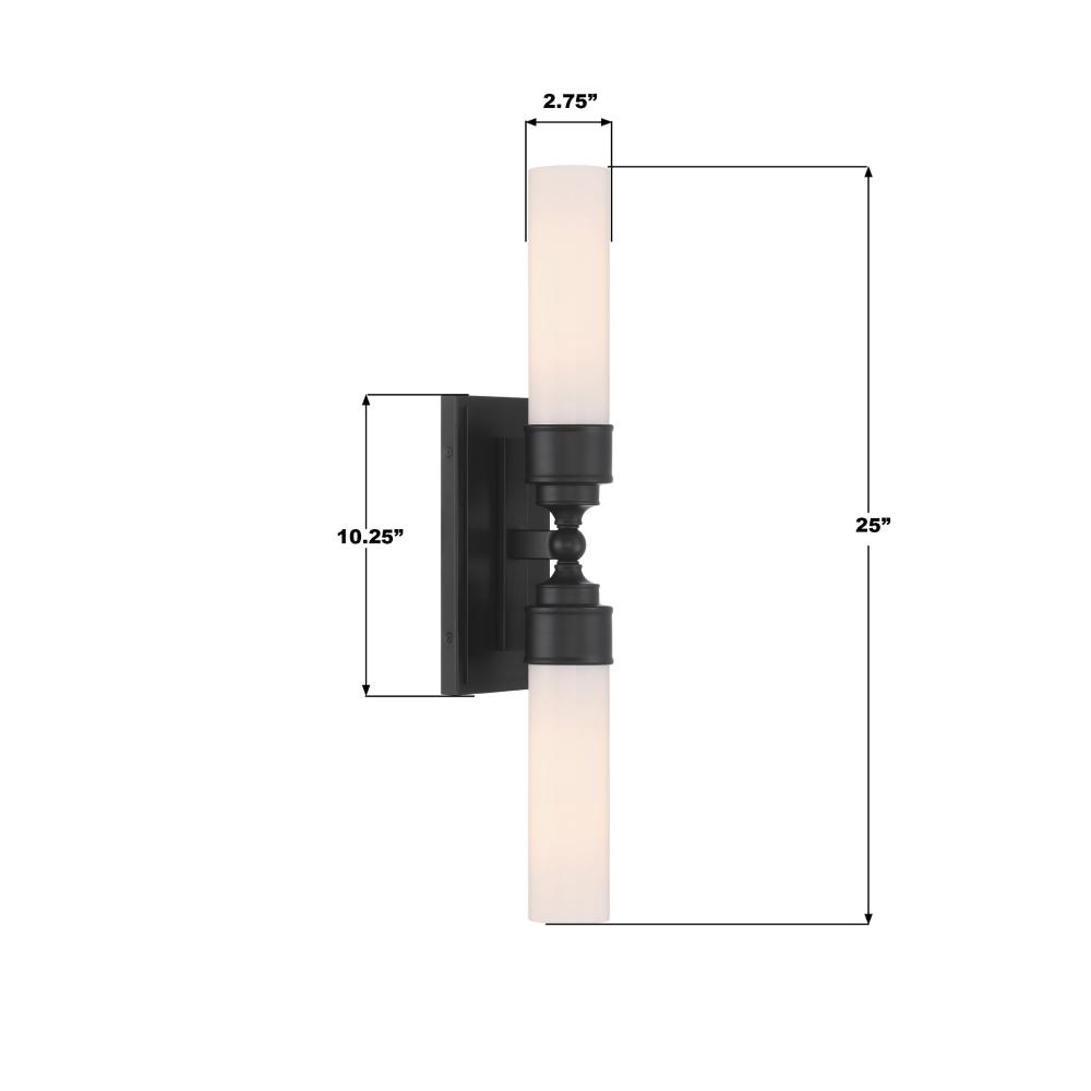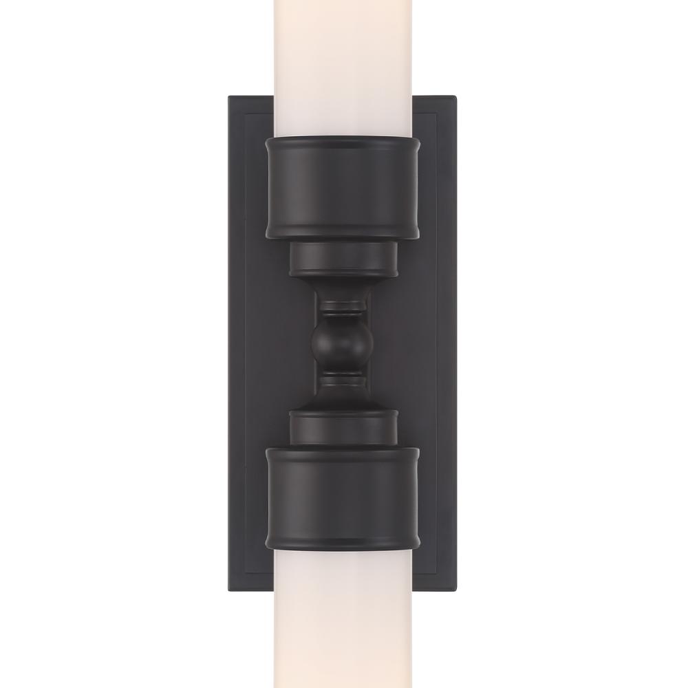 The Wilcox collection includes a white cylindrical glass shade and a rectangular back plate with stepped detailing. It is damp-listed for safe use in moisture-prone areas. The collection offers a single light option, suitable for mounting on either side of a mirror, and a double light option, perfect for placing over a vanity. This elegant fixture adds a sophisticated touch to bathroom spaces.