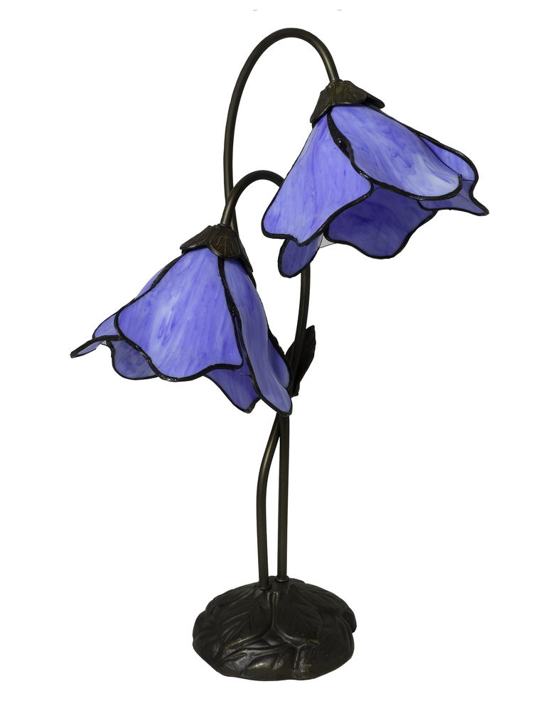 Our Poleking series of table lamps is an easy way to add unique color and charm to any room of your home. This 2 light lily lamp features two elegant lily blossoms in shimmery pink art glass. Each of the 5 panels on each shade feature fluid, graceful edges that faithfully recreate 2 delicate lily blossoms. The shades hang from 2 gracefully curved stems flowing from an intricately carved metal base, which is finished dark antique bronze. A perfect choice for a boudoir or powder room, this charming lamp is will provide your family with years of beautiful, reliable lighting.