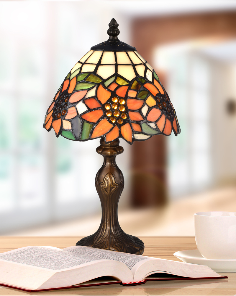 Bright and lively, our Discovery Table Lamp’s vintage feel will add a summery splash of color to your home. The deep dome shade features a background of light amber panels that are set in a grid pattern. A brilliant band of sunflowers in vivid orange and