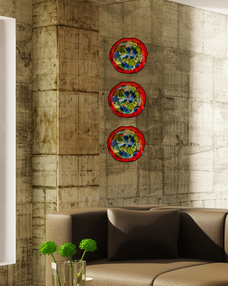 Our Favrile Art Glass Collection Plates are an ideal way to express your unique style and taste. Each plate can be hung alone or in multiples with the included bracket. The Hankley plate is a contemporary blend of leafy green sky blue and light blue that is swirled together at the plate’s center. The outside is bordered by deep, vivid red. Rich black is drizzled throughout the entire design and also borders Hankley’s outside edge. Not just for walls, our Favrile Art Glass Collection plates can be displayed as a centerpiece on a dining or coffee table; your creativity is limited only by your imagination.