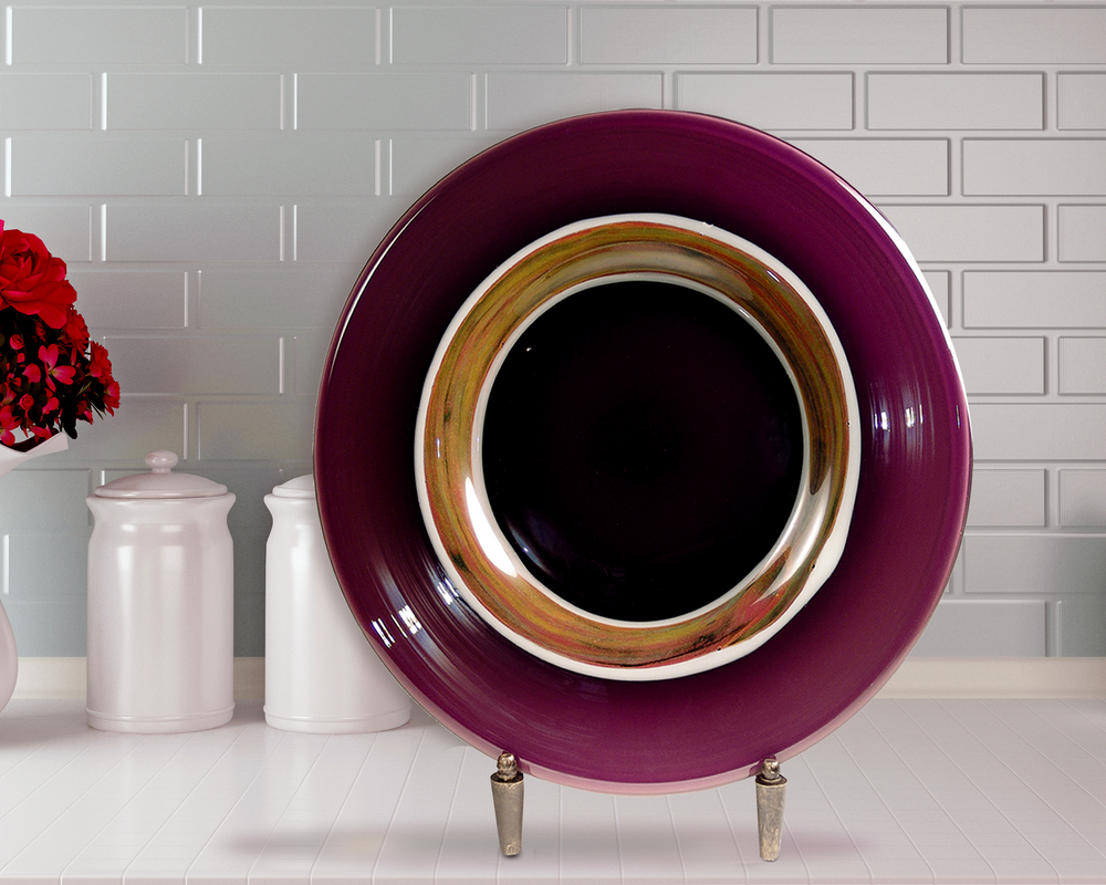Our Melrose Series of Favrile art glass giftware is crafted using bold, sophisticated styling that will complement any decor in your home. This magnificent charger is a generous 20” in diameter features a center of deep, dark purple, which is surrounded by a band of white with a swirled pattern of green, gold and amber. The outside edge is a lighter shade of mauve, which contrasts beautifully with the other colors. The charger is exquisite when displayed as a centerpiece on your formal dining table. We have included a stand to transform the charger into a breathtaking piece of art that will add a splash of elegant color to any room in your home.