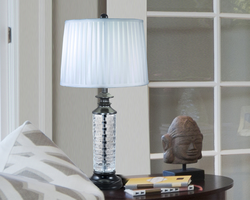 The casual elegance of our Overland 24% Lead Crystal Table Lamp easily assimilates into any décor style. The tall fixture features metal center column that is surrounded by a 24% lead crystal cylinder. The cylinder is delicately faceted in an allover basket weave pattern which is designed gently refract the lamplight outward into the room. We topped Overland with a pleated drum shade in crisp white softback fabric and complementary finial. The metal base is finished in deep Ebony Black, which provides an excellent contrast and adds to the contemporary feel. A perfect choice in living rooms or bedrooms, our Overland 24% Lead Crystal Table Lamp is crafted to last to provide you with many years of stylish and reliable lighting.