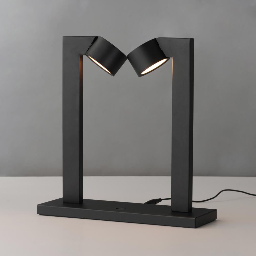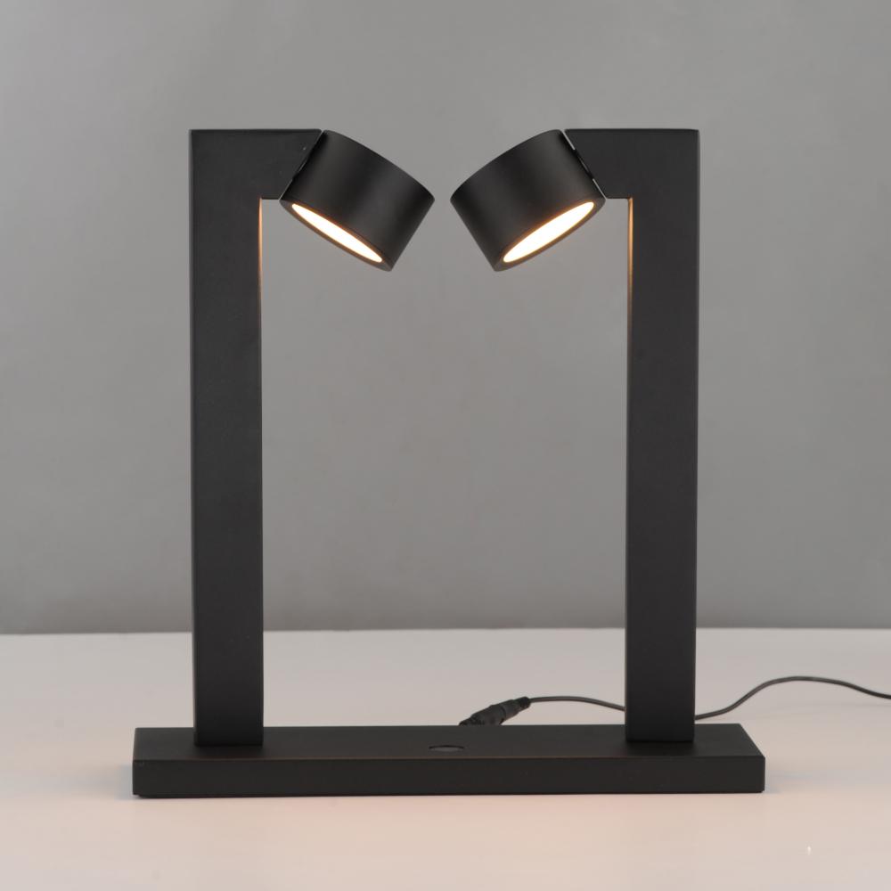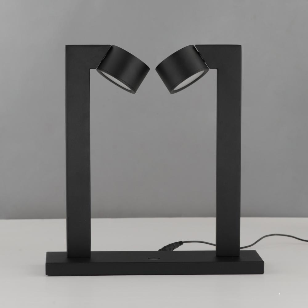 A modern matte black frame crafted with rectilinear tubing supports circular LED light modules. Designed to appear as if they are facing each other in an embrace, the modules create a harmonious and dynamic aesthetic. The two modules, positioned at opposit