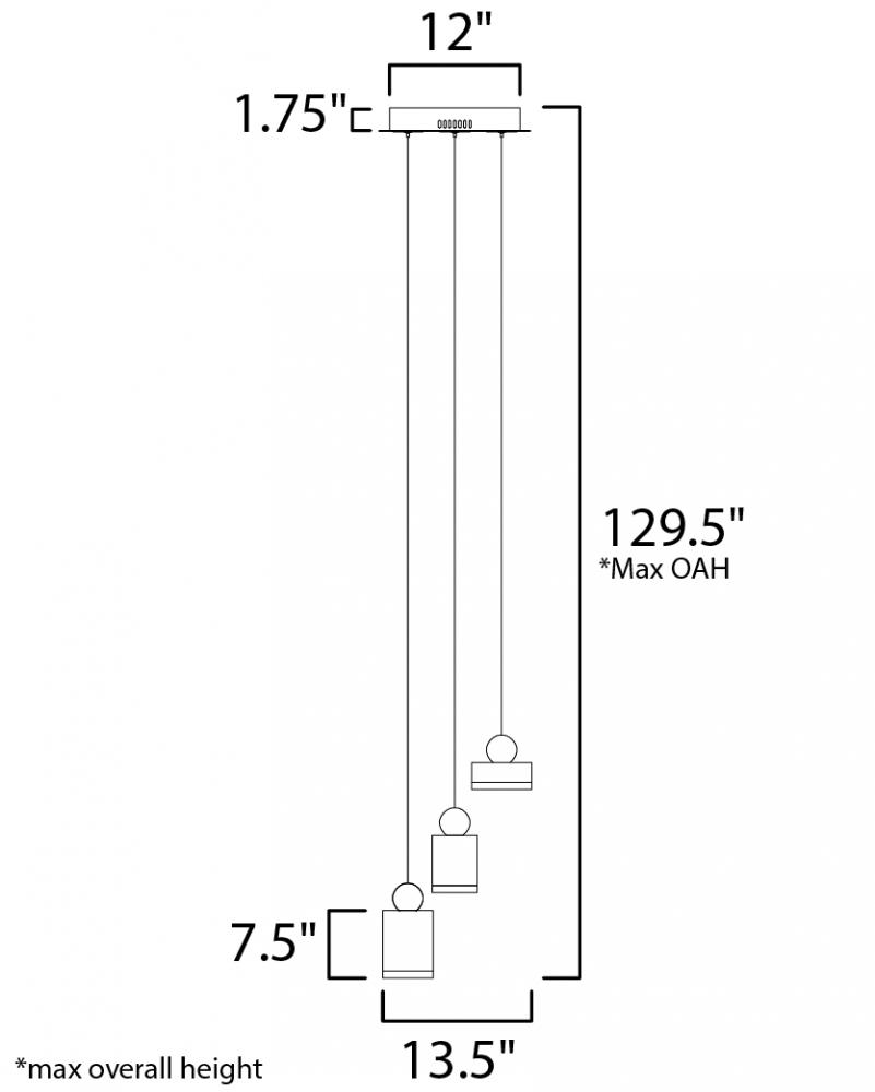 These geometric pendants can be arranged at various heights to create both a sculptural and functional form. Housings of plated Gold in various shapes and sizes are topped with a round handle of Black and finished on the bottom with a Clear acrylic diffuse
