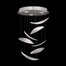 Elevate raises your environment to new heights. Each "plume" is handblown and sculpted with a translucent mixture of clear crystal and white glass. Illuminated from a soft gold leaf canopy and suspended by adjustable cables, this Made in America round fixture features 7 handblown glass "plume"s and is ideal for low ceilings.