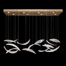 Elevate raises your environment to new heights. Each Crystal Stardust glass spire is hand sculpted with translucent clear crystal and surrounded by a clear crystal casing. Illuminated from a soft gold leaf canopy and suspended by adjustable cables, this Made in America rectangular fixture features 20 sculpted spires and is ideal for low ceilings. Shown in a “horizontal” design.