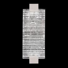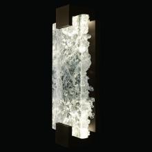 Indoor/outdoor aluminum sconce features a three-dimensional contrast of deep textured and polished cast glass. This stunning landscape of the glass, illuminated by waterproof LEDs, is available in clear (shown) or highlighted with antiqued gold leaf. Choice of three finishes, champagne tinted gold leaf finish or silver leaf for indoor only, and a hand rubbed black iron for indoor and outdoor use.