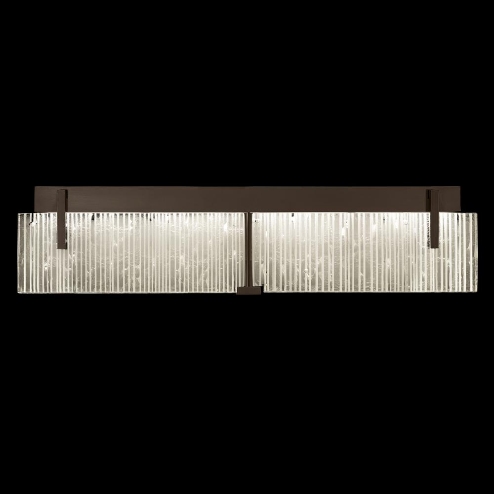 Luxury bath fixture featuring “Rake” cast glass. Inspired by Zen patterns formed with tiny pebbles, “Rake” combines monumental cast glass with deep hand carved patterns, perfectly captured by an array of hidden waterproof LEDs, giving the glass a truly contemporary feel to an ancient pattern. Choice of four finishes, champagne tinted gold leaf finish, silver leaf, bronze or hand rubbed black iron. For Indoor use only.