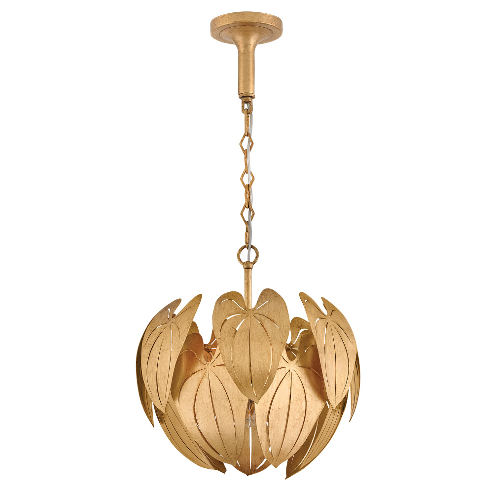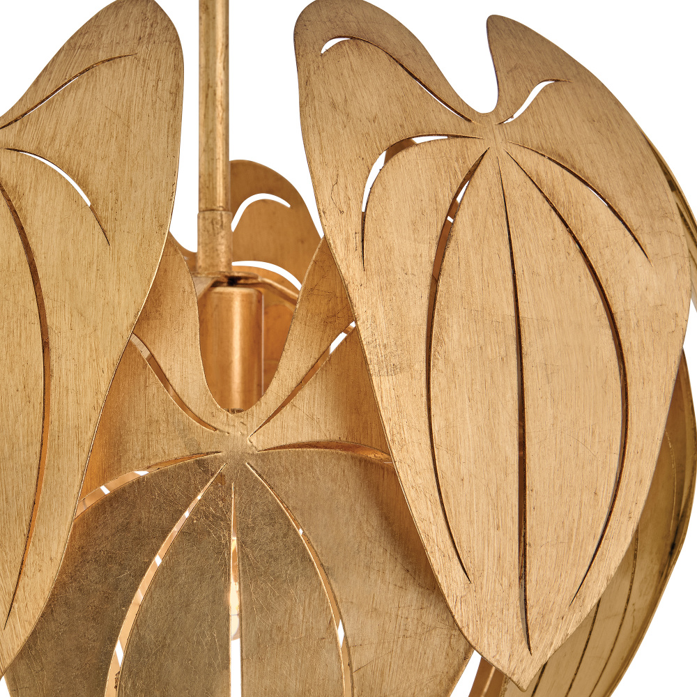 Inspired by the grand leaves and distinct veining of anthurium plants, found in the tropical cloud forests of South America, Camille brings botanical beauty to your living space. Each Distressed Brass layer is artfully laser-cut, shaped, and hand-painted with gold leaf to create a luxe transitional design, suspended by diamond-shaped chains and a tapered canopy.