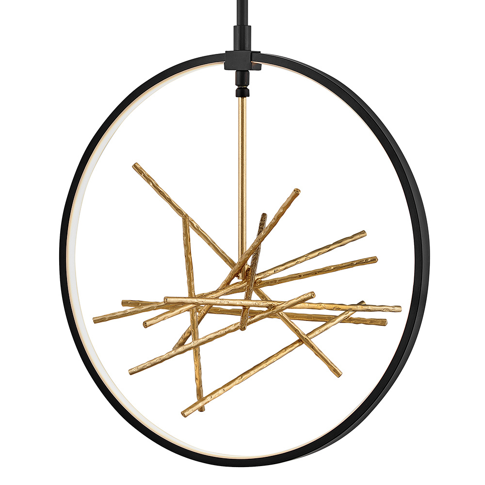 The breathtaking design of Styx fuses rich glamour with modern styling for an enthralling and dynamic silhouette with unexpected elements. An integrated LED open frame is fully dimmable, composed of clean angles in a chic Black finish. The frame illuminates textured metal branches in Gilded Gold, mingling organic and contemporary elements.