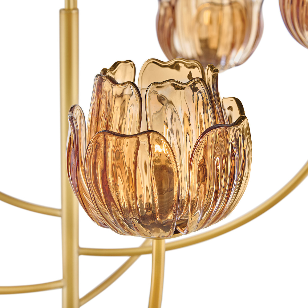 Fantine’s flowing blooms are inspired by preserved flowers suspended in time. Uniquely shaped artisan-sculpted glass arranged in lush layers creates an ethereal dance of light and shadow. An exaggerated canopy and slender stems are crafted from solid brass in a hand-touched Unlacquered Brass finish.