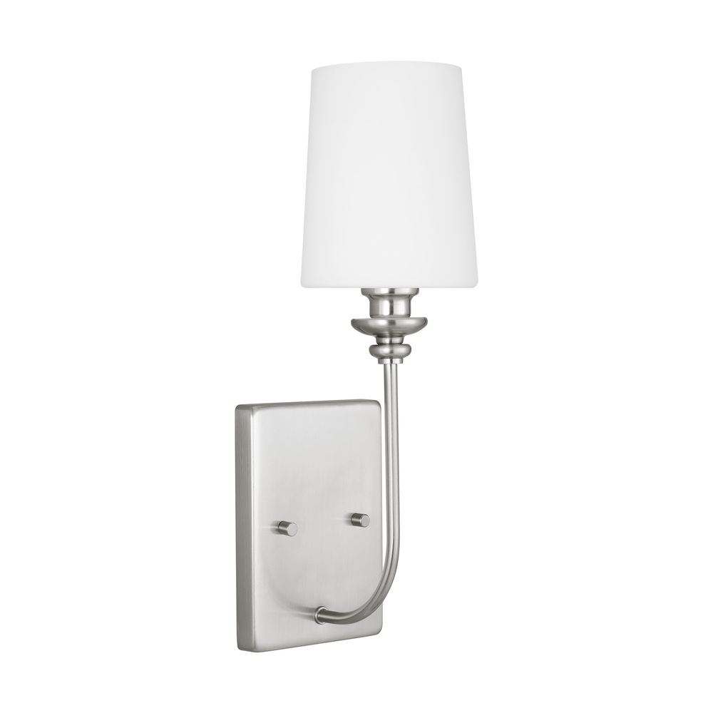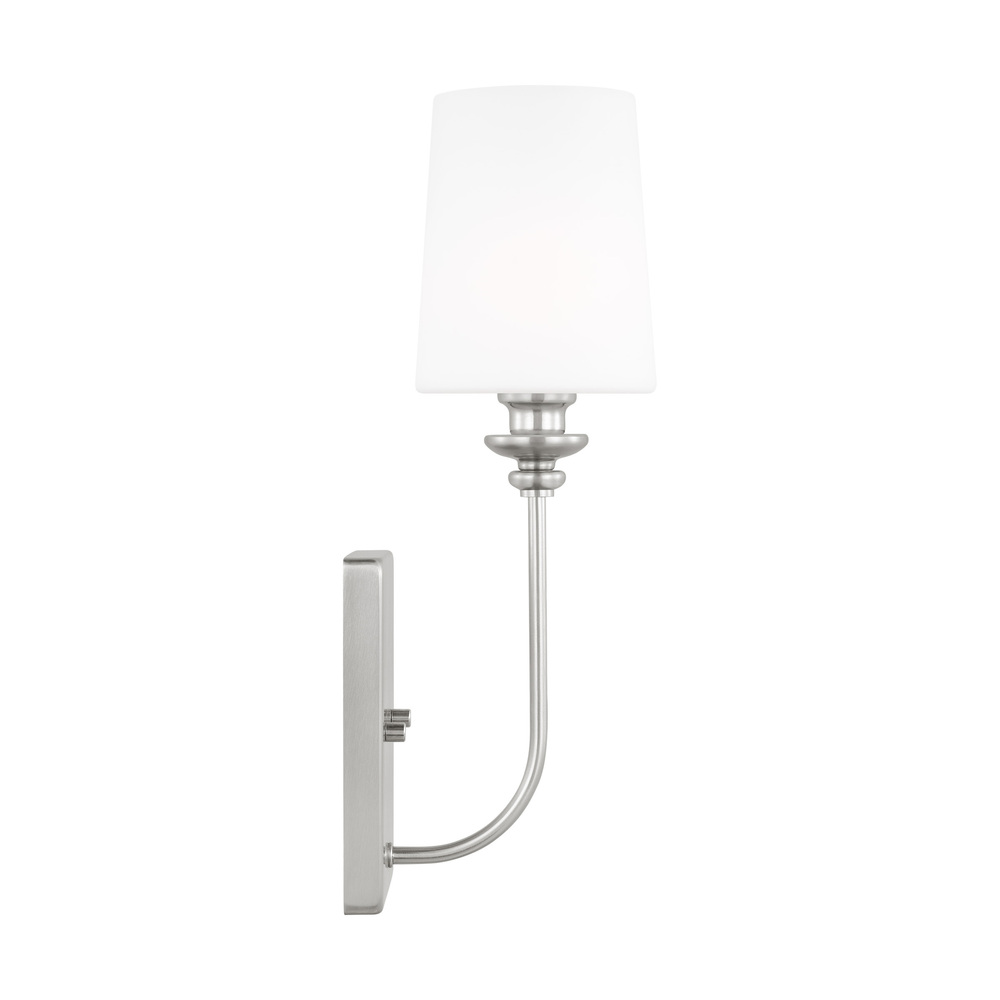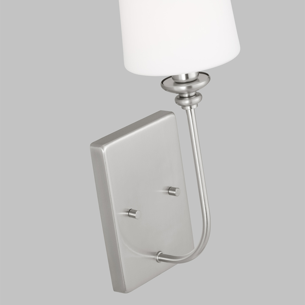 A traditional design gets a contemporary makeover in this glamorous one-light armed sconce – perfect for brightening your hallway, bathroom, or master suite! Crafted of metal in three fashionable finishes, this fixture features a clean-lined square backplate with simple moldings and side screw holes, while one short arm extends from its center. Topping a streamlined torch, a white fabric tapered cone shade ensconces one LED bulb (not included) to diffuse bright light as it’s dispersed throughout your space.