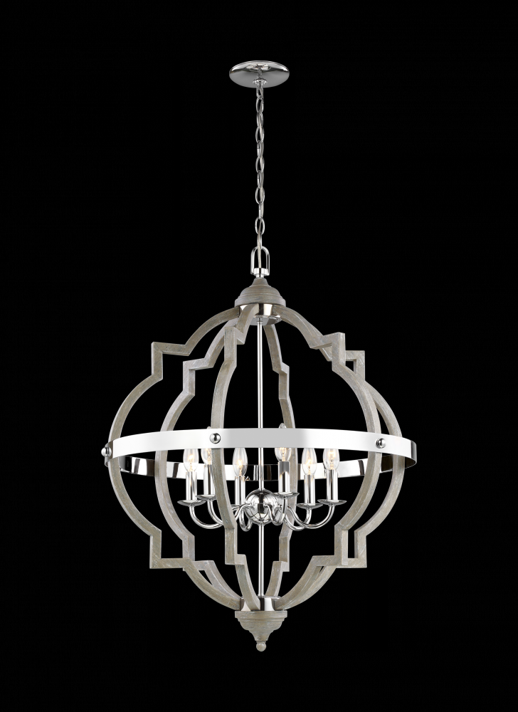 The Sea Gull Lighting Socorro Six Light Indoor Pendant In Washed Pine Enhances The Beauty Of Your Home With Ample Light And Style To Match Today'S Trends. The Transitional Socorro Lighting Collection By Sea Gull Lighting Features A Classic, Barbed Quatrefoil Profile - Wholly Updated By Combining A Distressed Cerused Oak Finish On The Decorative Silhouette With The Rich Stardust Finish On The Metal Bobeches And Decorative Strapping To Create Undeniable Rustic Charm. While Still Offered In Its Original Finish Stardust, The Socorro Has Been Beautifully Updated With Our Popular Washed Pine And Chrome Finish To Offer A Modern Take On This Timeless Industrial Beauty. The Collection Includes A Four-Light Mini-Chandelier, Medium And Large Six-Light Chandeliers, And Four-Light And Six-Light Hall / Foyer Pendants. Incandescent Candelabra Base Lamping.