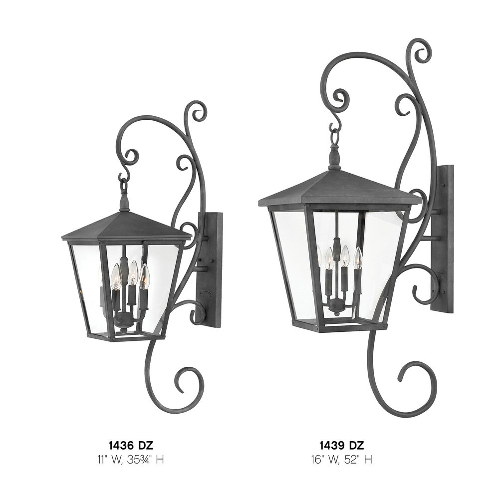 Trellis is a traditional European lantern design in an Aged Zinc finish with clear glass or Regency Bronze with clear seedy glass. The large scroll arm detail, cast loop finial and true rivet detail create a refined elegance.