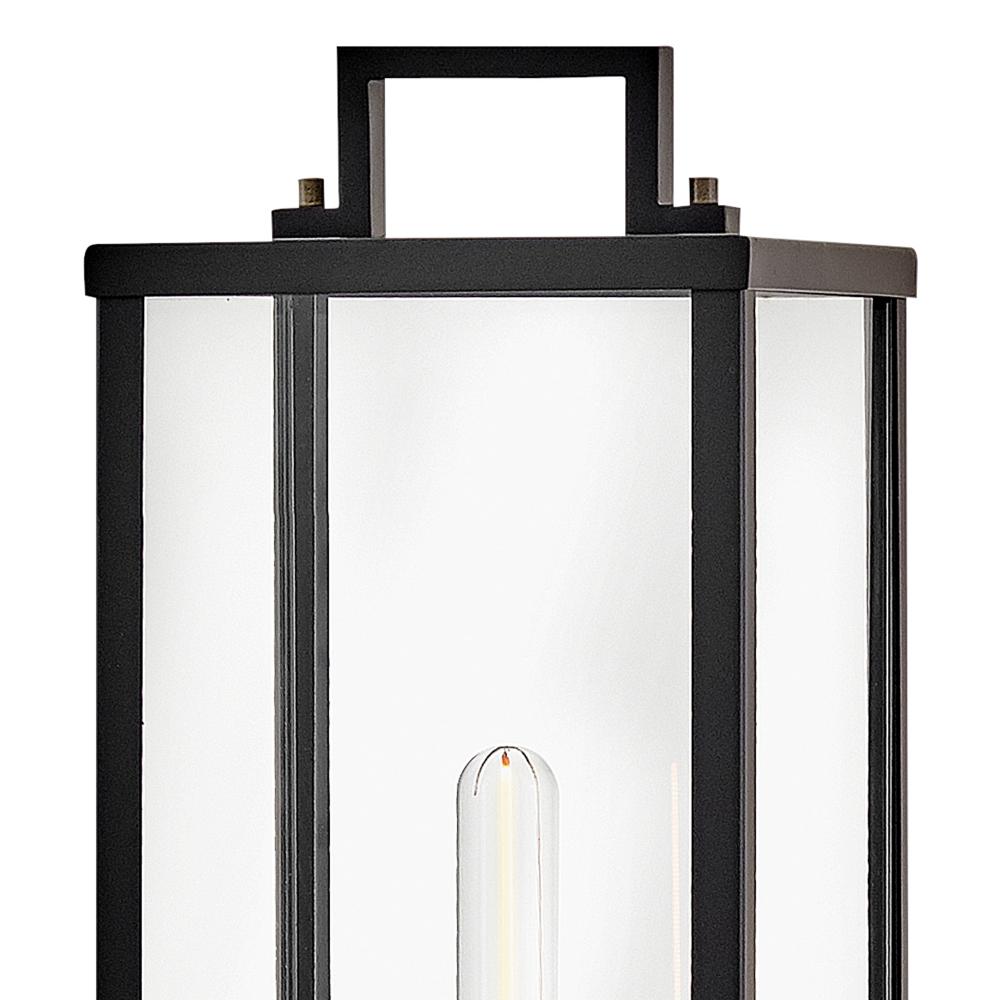 Striking and airy, Catalina breathes modern simplicity into outdoor spaces. Oversized clear glass, a unique single socket, and a two-tone Black with Burnished Bronze finish pair perfectly to present a statement-making fixture. The finishing touch is a floating effect created by the classic rectangular lantern design suspended from a top knob.