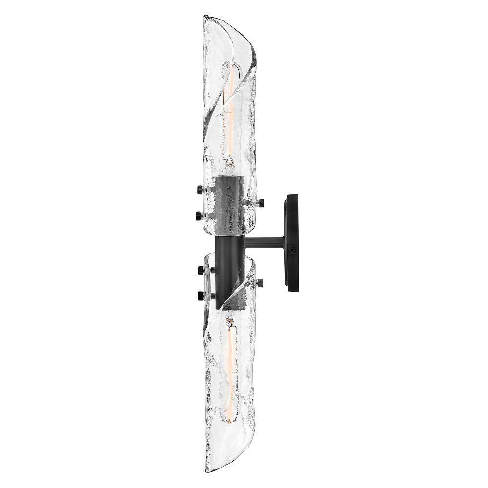 Evoking the movement of flowing water, Capri’s linear, clear glass shades are pressed to create a subtle crystalline texture, then twisted and shaped by hand. Metal backplates and rounded knobs finished in Black or Distressed Brass provide balance that anchors the organic form, resulting in a look that feels both refreshing and refined.