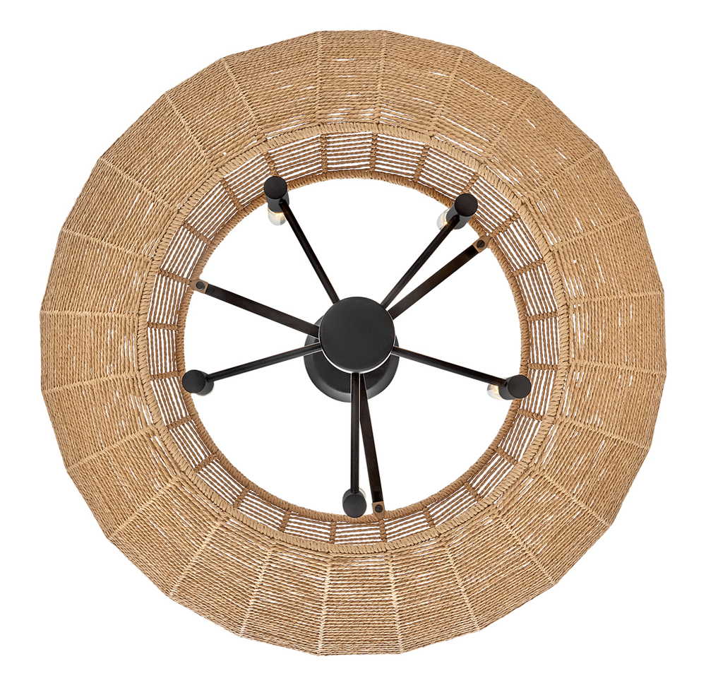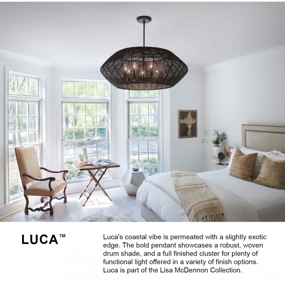 Luca's coastal vibe is permeated with a slightly exotic edge. The bold pendant showcases a robust, woven drum shade, and a full finished cluster for plenty of functional light offered in a variety of finish options. Luca is part of the Lisa McDennon Collection.