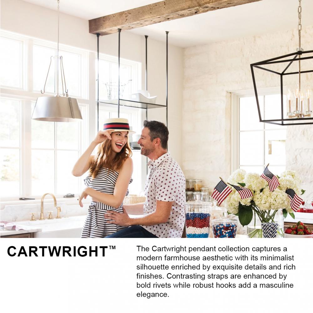 The Cartwright pendant collection captures a modern farmhouse aesthetic with its minimalist silhouette enriched by exquisite details and rich finishes. Contrasting straps are enhanced by bold rivets while robust hooks add a masculine elegance.