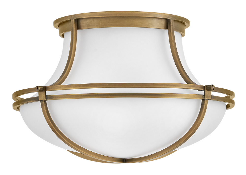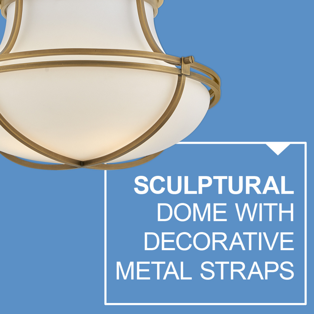 Saddler’s sculptural tear-drop dome forms a chic silhouette accentuated by decorative metal straps. Etched opal glass complemented by a Heritage Brass or Black finish creates a versatile design with high style.