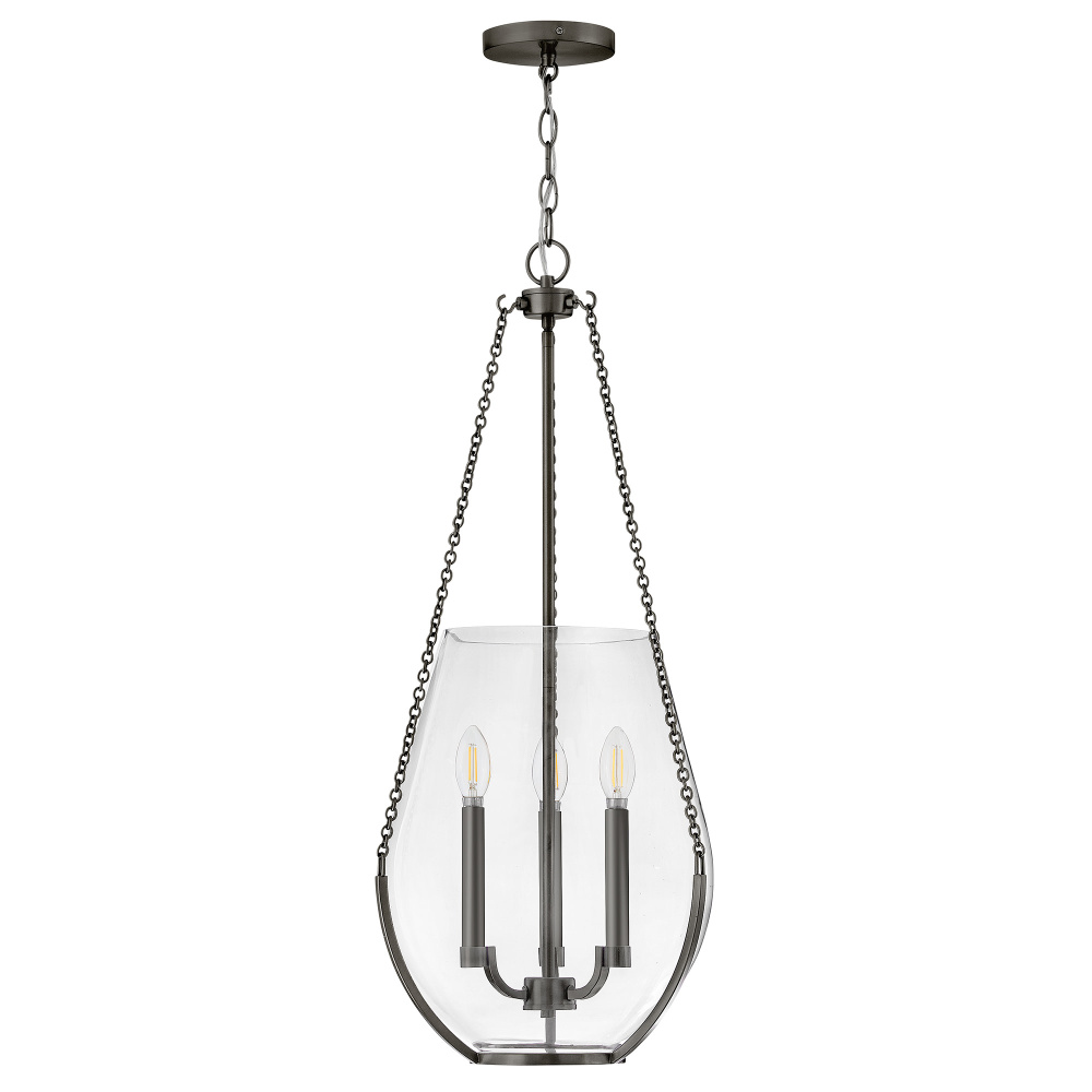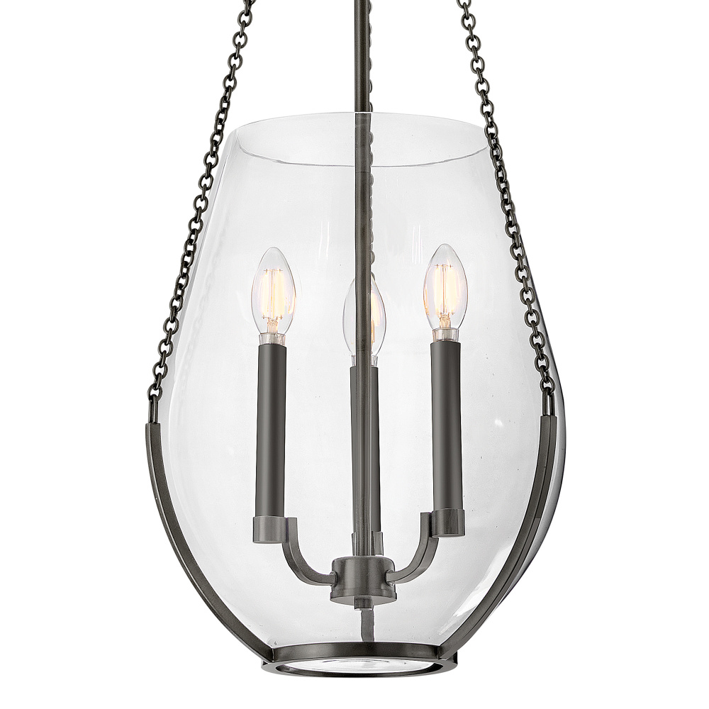 Distinguished by its substantial teardrop silhouette and large, Clear glass shade suspended from decorative chains, Farrin’s traditional styling brings sophistication to your living or dining space. A central cluster of brilliant candelabra lamps is accented by a three-armed frame and matching candle sleeves in a Lacquered Brass or dark Gunmetal finish.