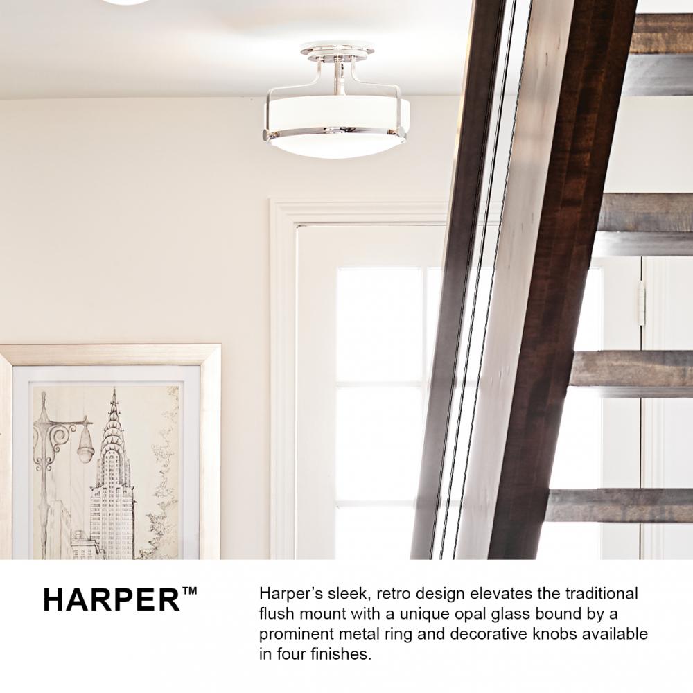 Harper’s sleek, retro design elevates the traditional ceiling mount with a unique clear seedy glass bound by a prominent metal ring and decorative knobs. Available in five classic finishes.