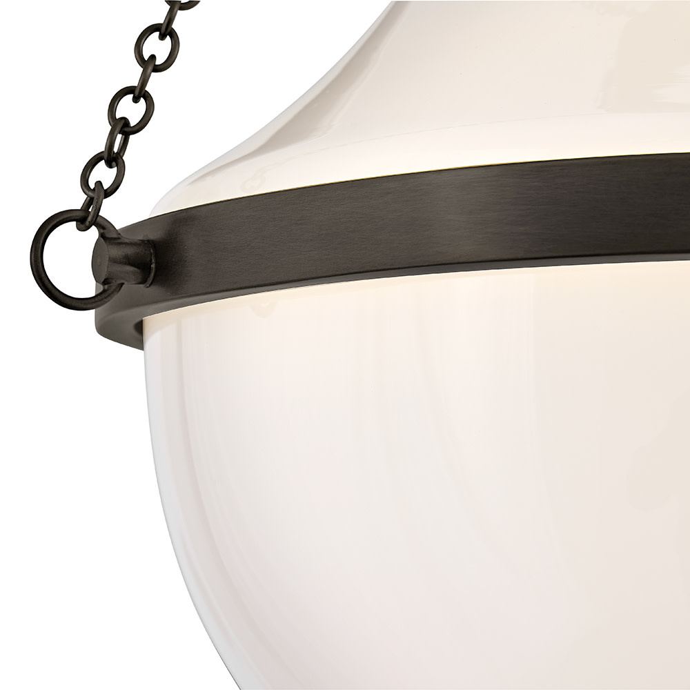 Fusing a sculpted, modern form with classically styled details, Collins features a transitional teardrop shade crafted from blown, cased opal glass. A central metal band and delicate chain uprights are available in Heritage Brass or Black Oxide finishes.