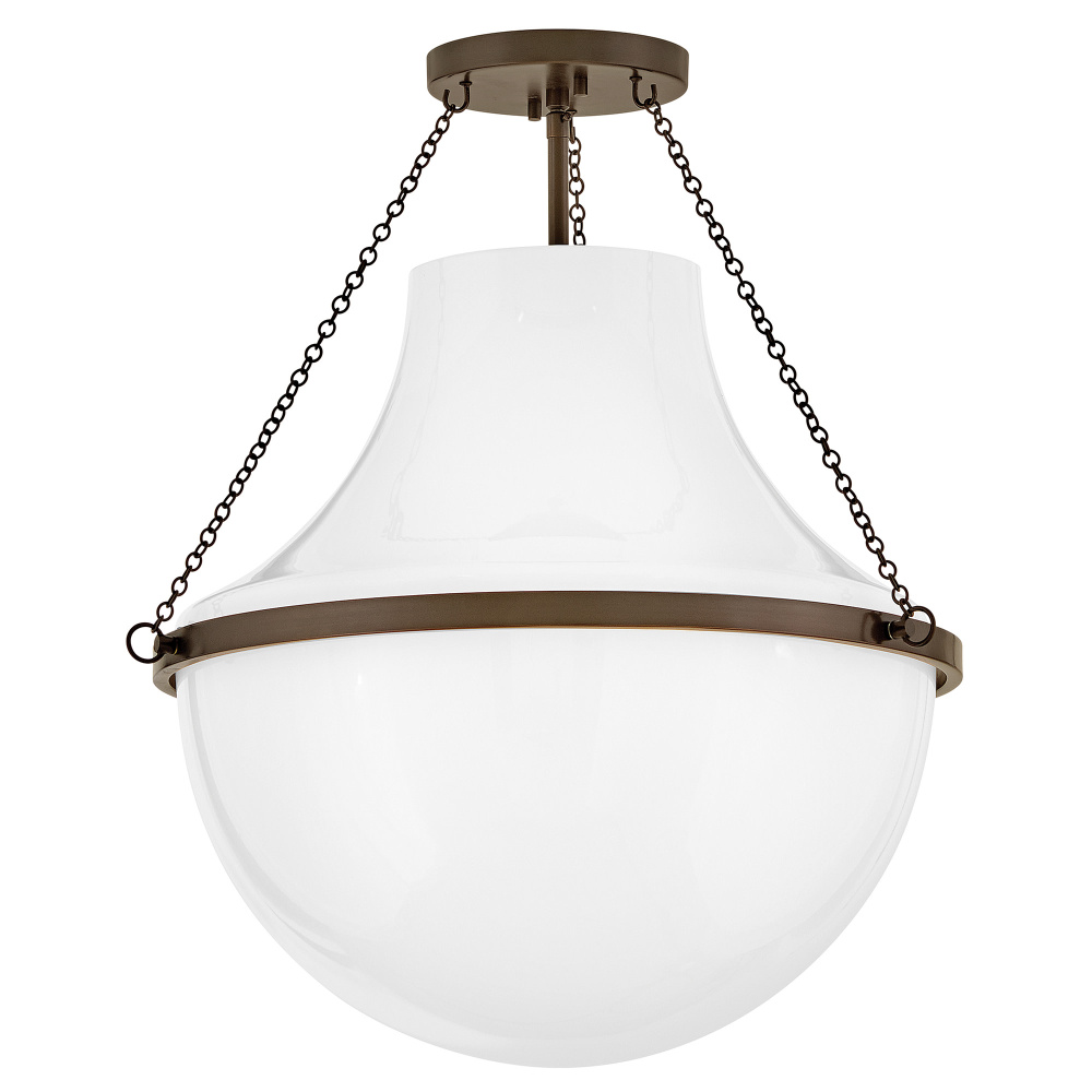 Fusing a sculpted, modern form with classically styled details, Collins features a transitional teardrop shade crafted from blown, Cased Opal glass. A central metal band and delicate chain uprights are available in Black Oxide, Heritage Brass, Heritage Bronze, or Polished Nickel finishes.