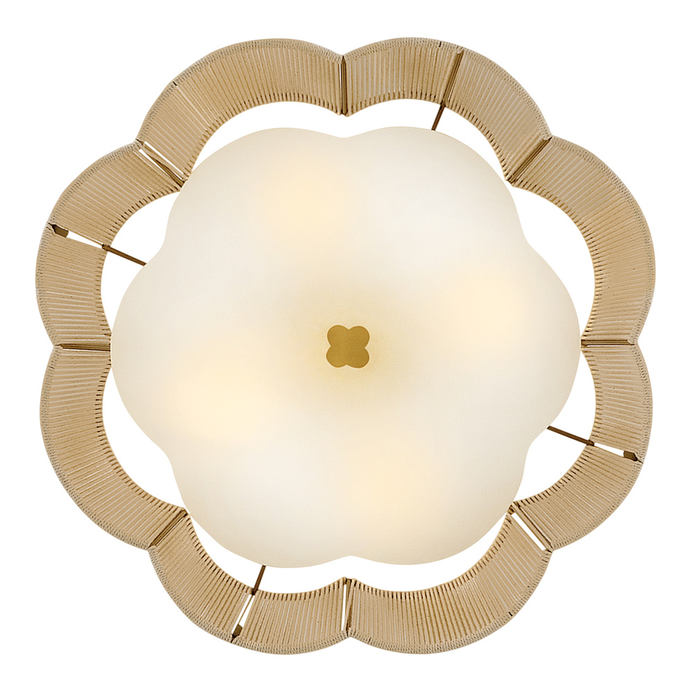 A chic yet casual decor statement infused with natural texture, Sasha’s subtly tapered, scalloped shade is hand-wrapped in natural-fiber cord, imparting an unexpected element of sheer softness to your decor. A clover-shaped Etched glass diffuser glows with welcoming illumination, secured by a complementing clover finial and a frame finished in Lacquered Brass.