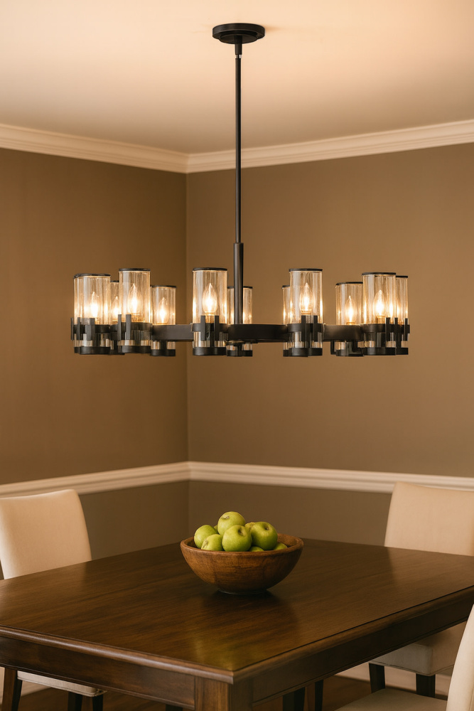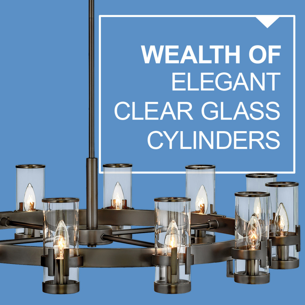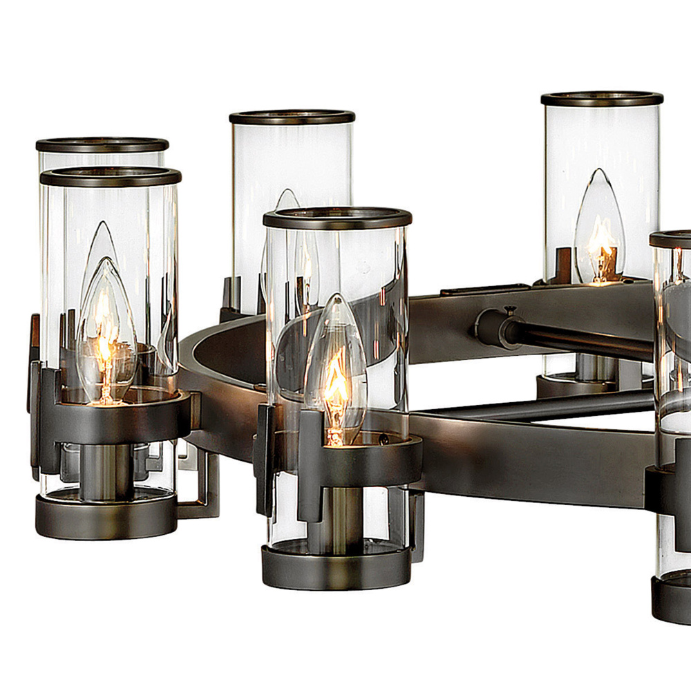 The Reeve chandelier balances sophistication with simplicity. The traditional low-profile silhouette is elevated by a wealth of elegant clear glass cylinders. Each glass is secured with a cast double-T bracelet matching the frame's luxurious finish with a corresponding metal band at the top.