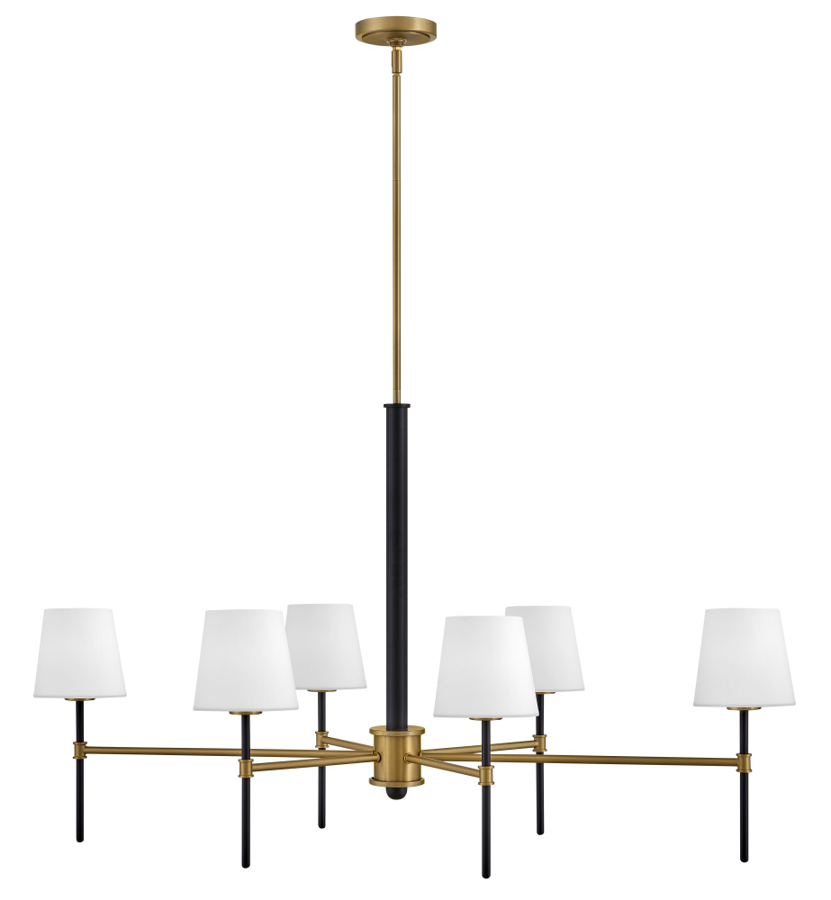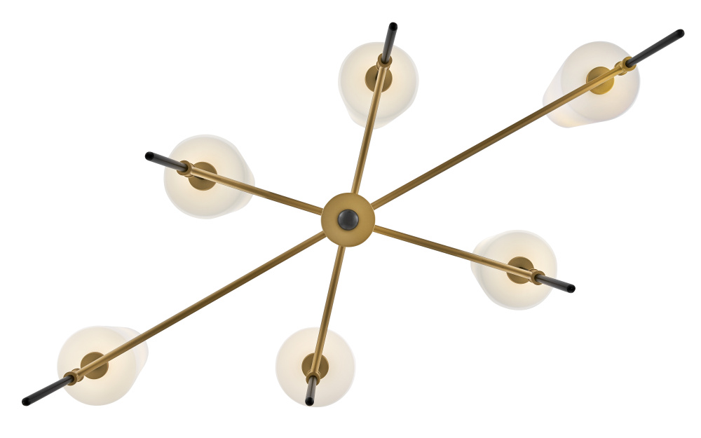 Saunders boasts a striking yet effortless appeal, blending traditional elements with captivating, mid-century modern details. A spoked silhouette and decorative stem holders are finished in Black and Lacquered Brass, paired with blown, etched opal glass shades.