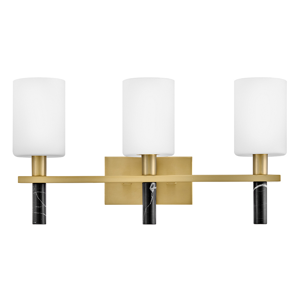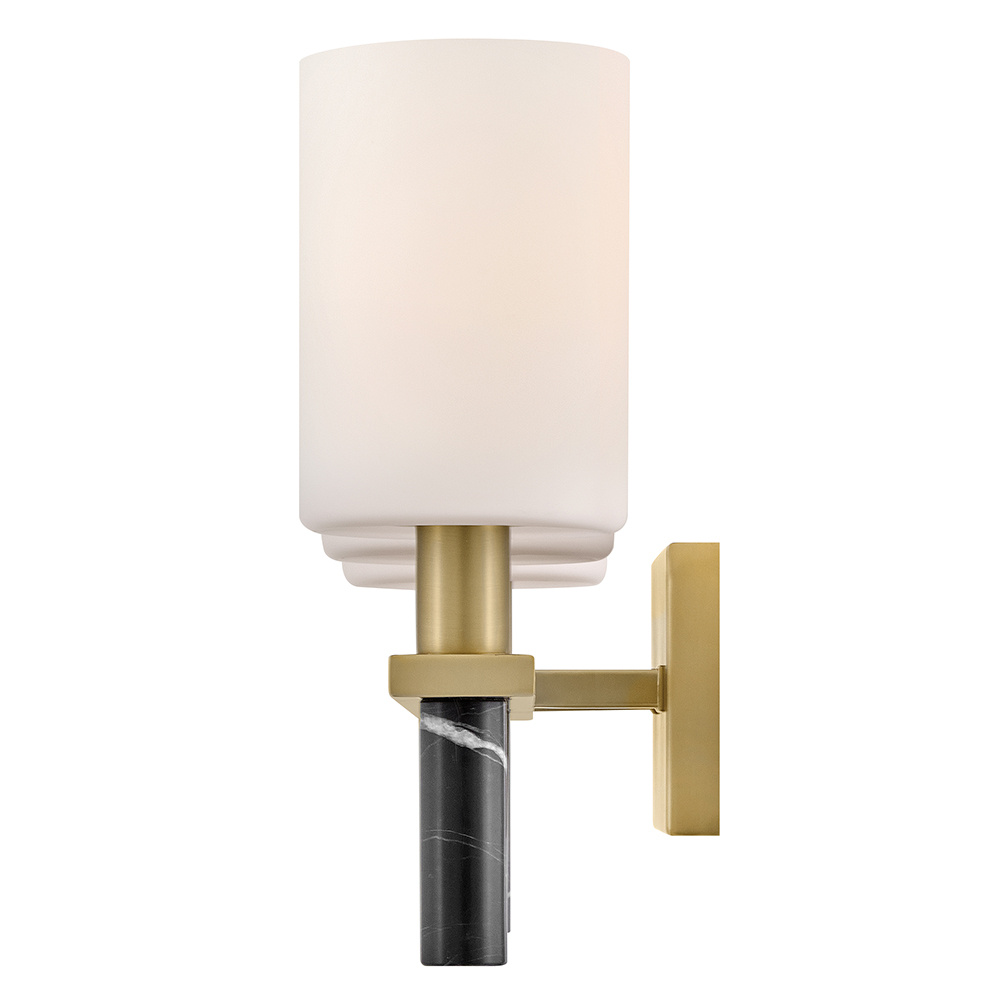 Polished with an understated silhouette, Turin is elevated by tall Etched Opal Glass and luxurious black marble stems. A minimalist backplate finished in vibrant Lacquered Brass complements the natural stone with an elegant touch of warm color.
