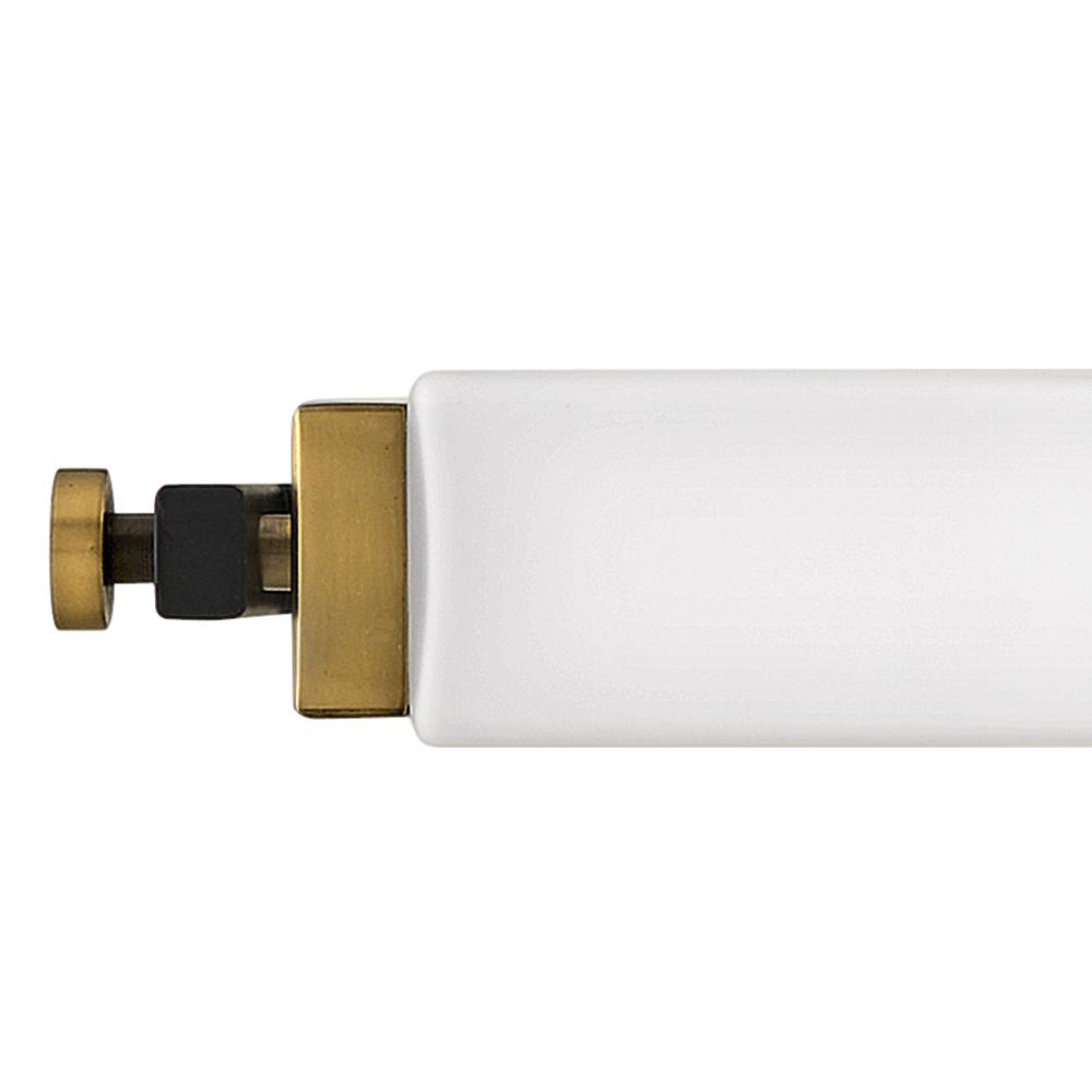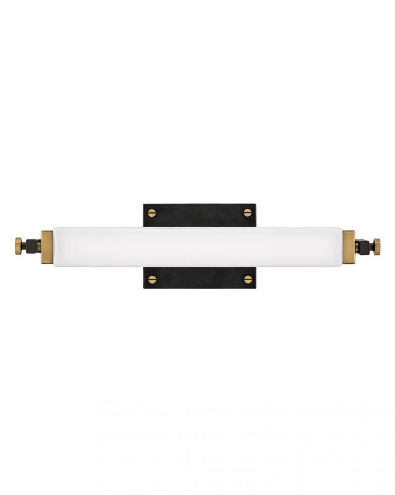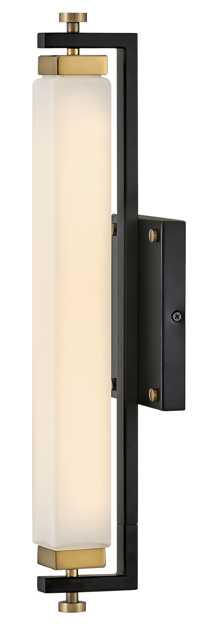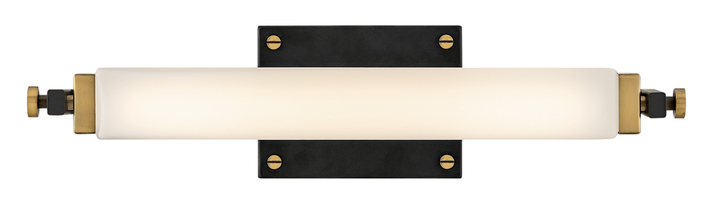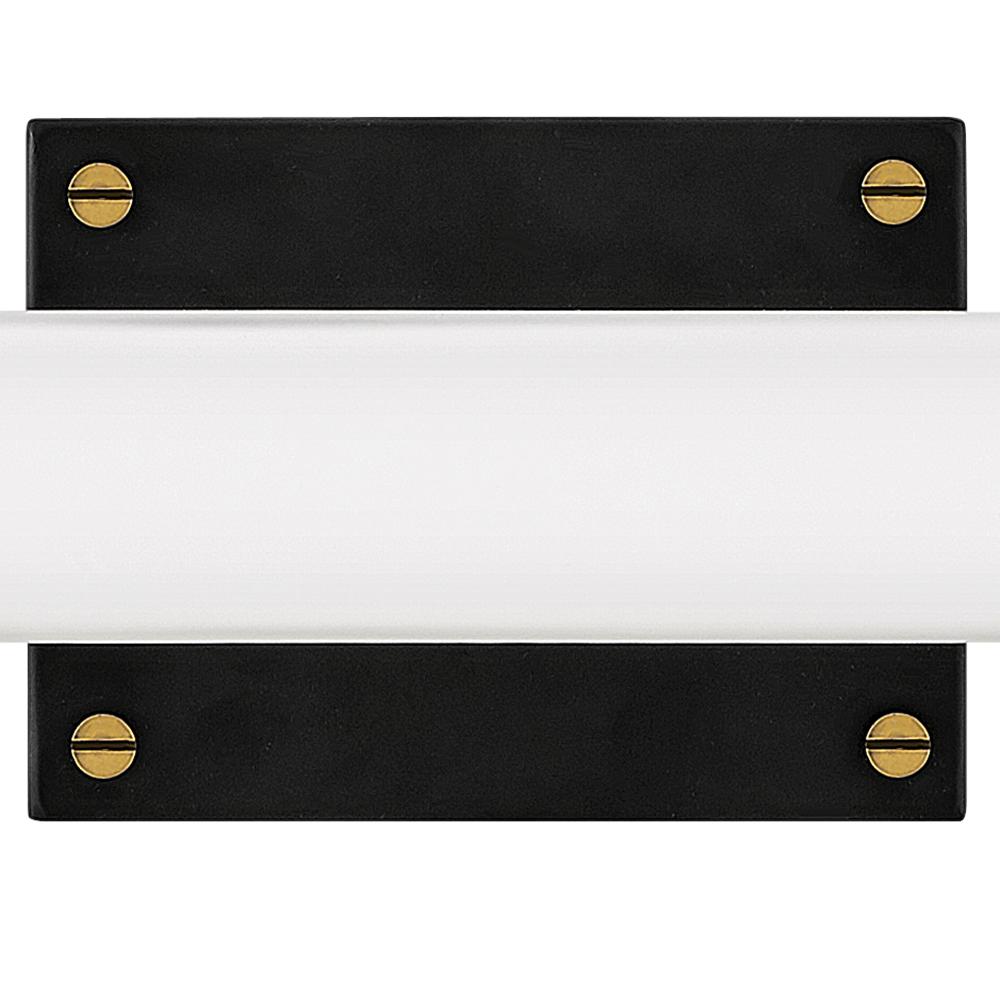 Rollins is both industrial in form and transitional in style. Unique rectangular etched opal glass has softly rounded edges offset by contrasting details on the backplate and the square knobs anchoring either end. This integrated LED design comes in two finish combinations, Black with Chrome and Black with Heritage Brass, and can be hung both vertically and horizontally.